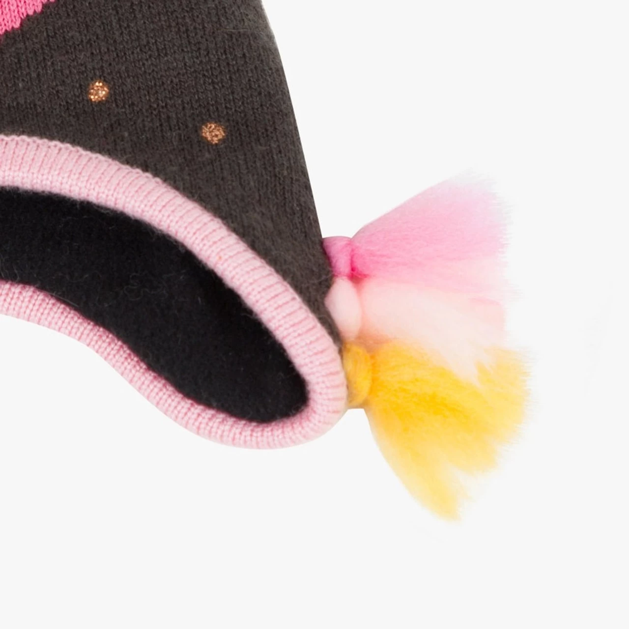 Wool warmed and lined with microfleece, the hat for girls is an escape in a simple jacquard landscape on a pink background. Jacquard pattern tinged with soft metallic touches. Coloured woollen strands on the side. Warm and soft dark khaki lining. Headband with a supple ribbed finish. Catamini signature logo. Matching snood and mittens in the ColorLama babywear theme.
