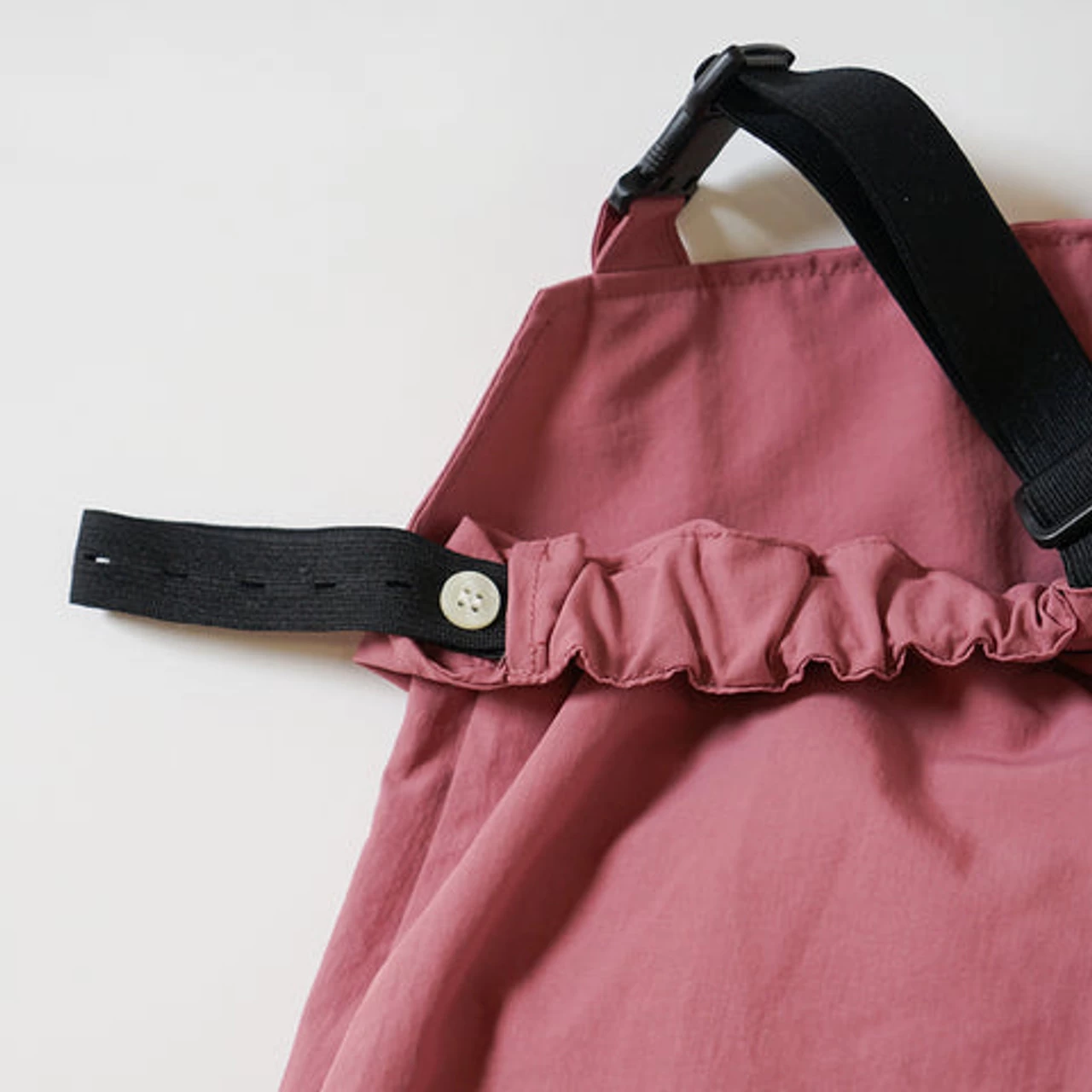 The water-repellent fabric lets you play to your heart’s content without worrying about dirt or water. Elastic is used for the shoulder straps, back, and hem, and the silhouette can be changed for a wide range of wear according to growth and situations.
