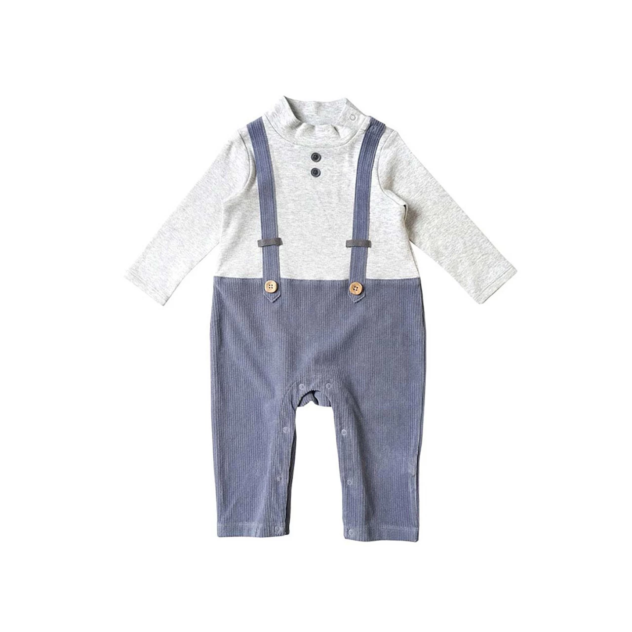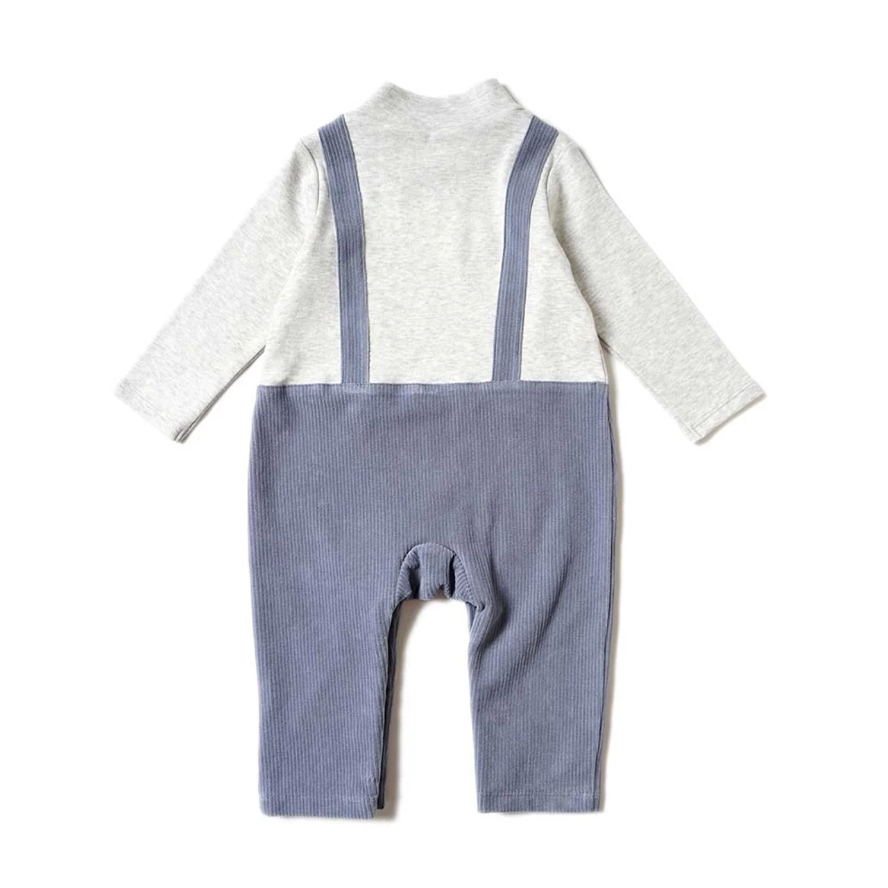 A coverall that can be coordinated with a single piece that combines a mock neck top and suspender pants.