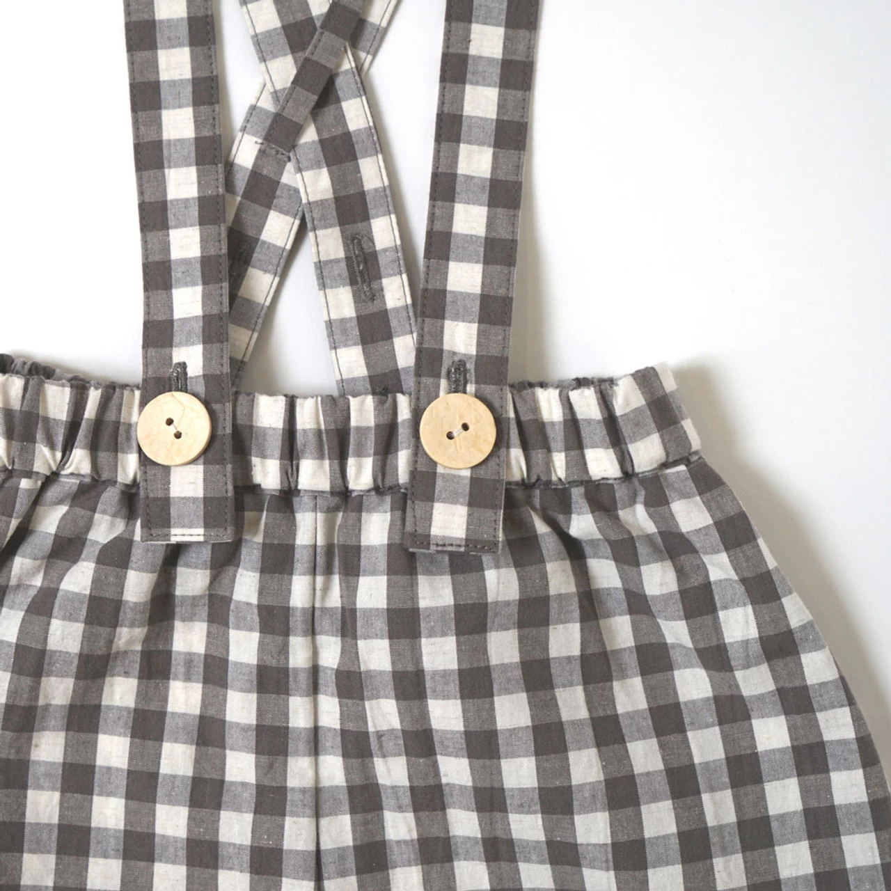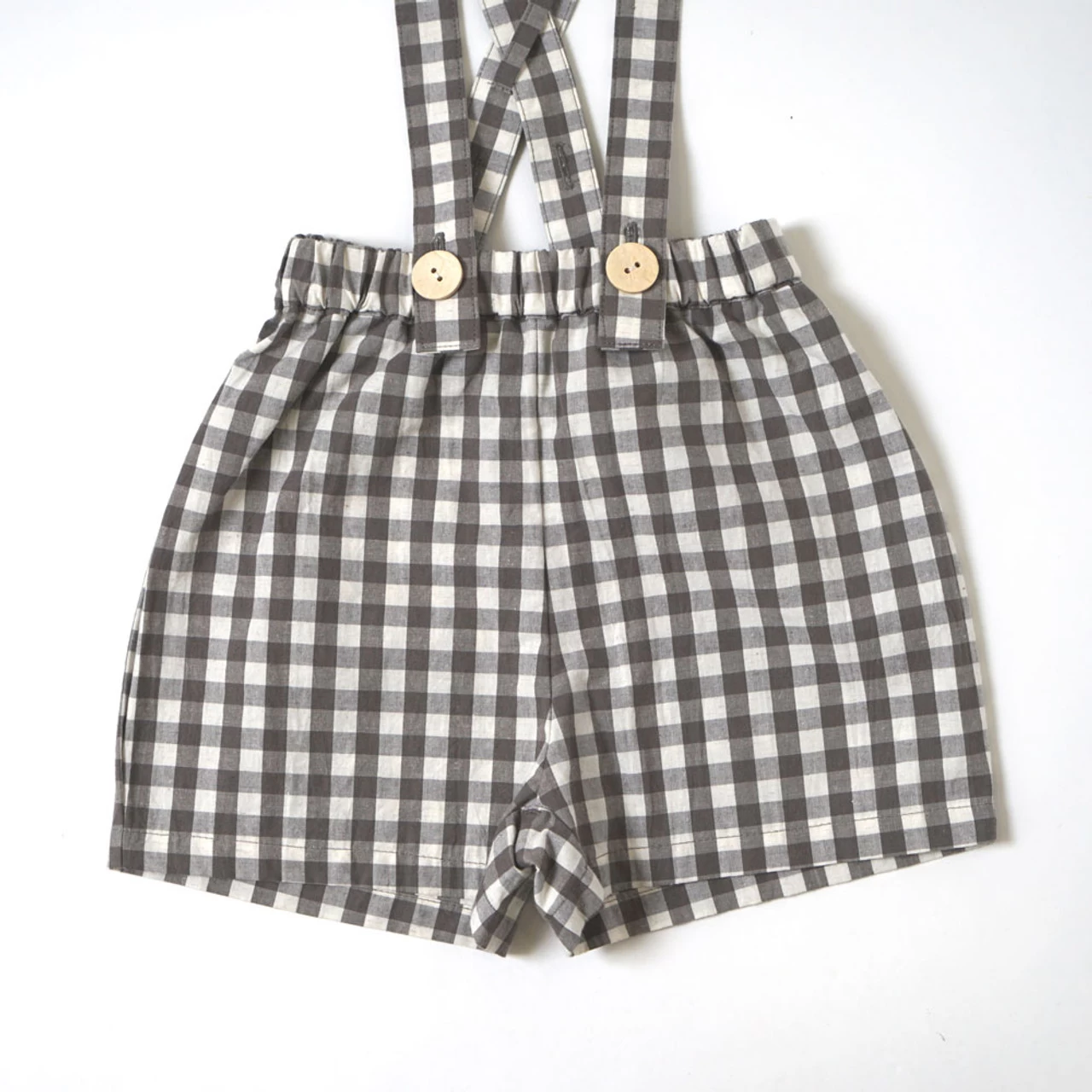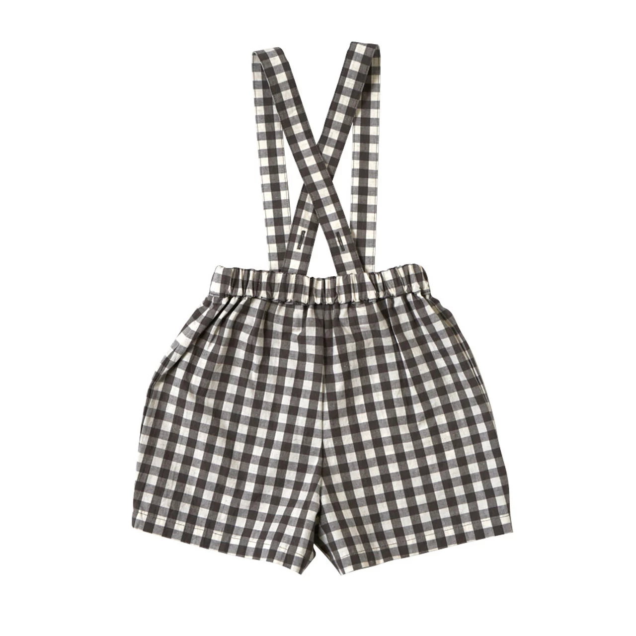 Gingham plaid shorts with removable suspenders.