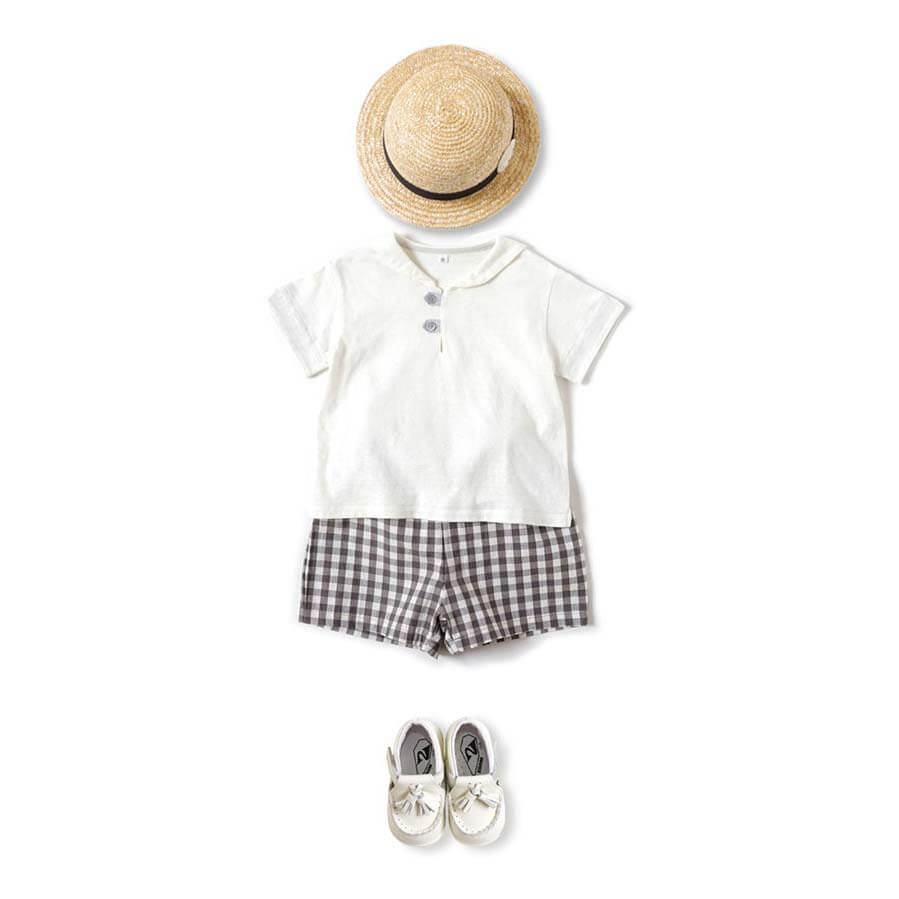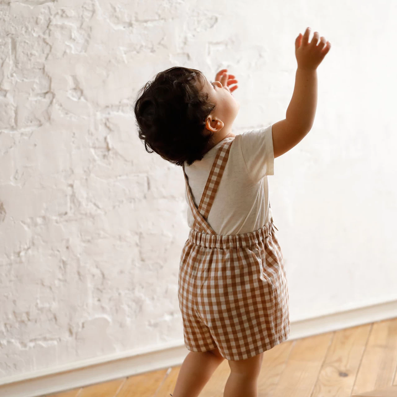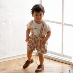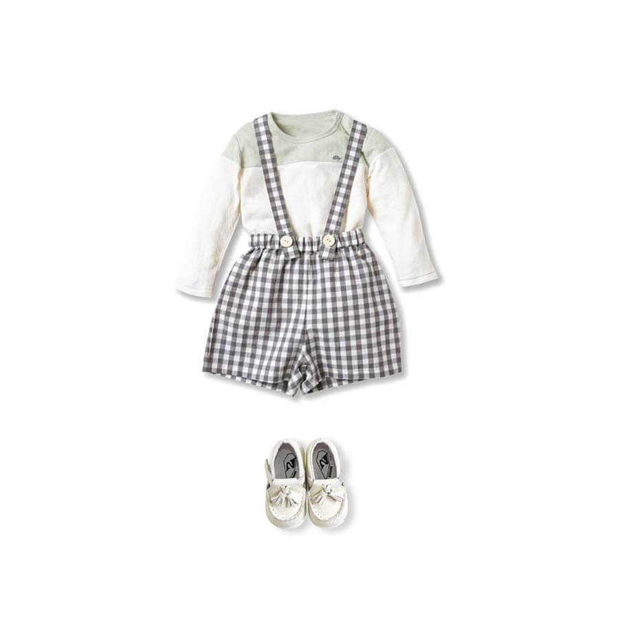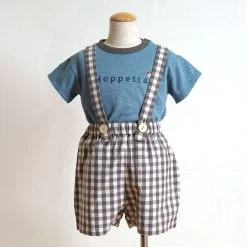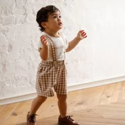 Gingham plaid shorts with removable suspenders.
