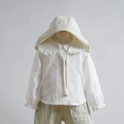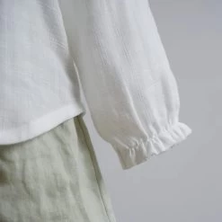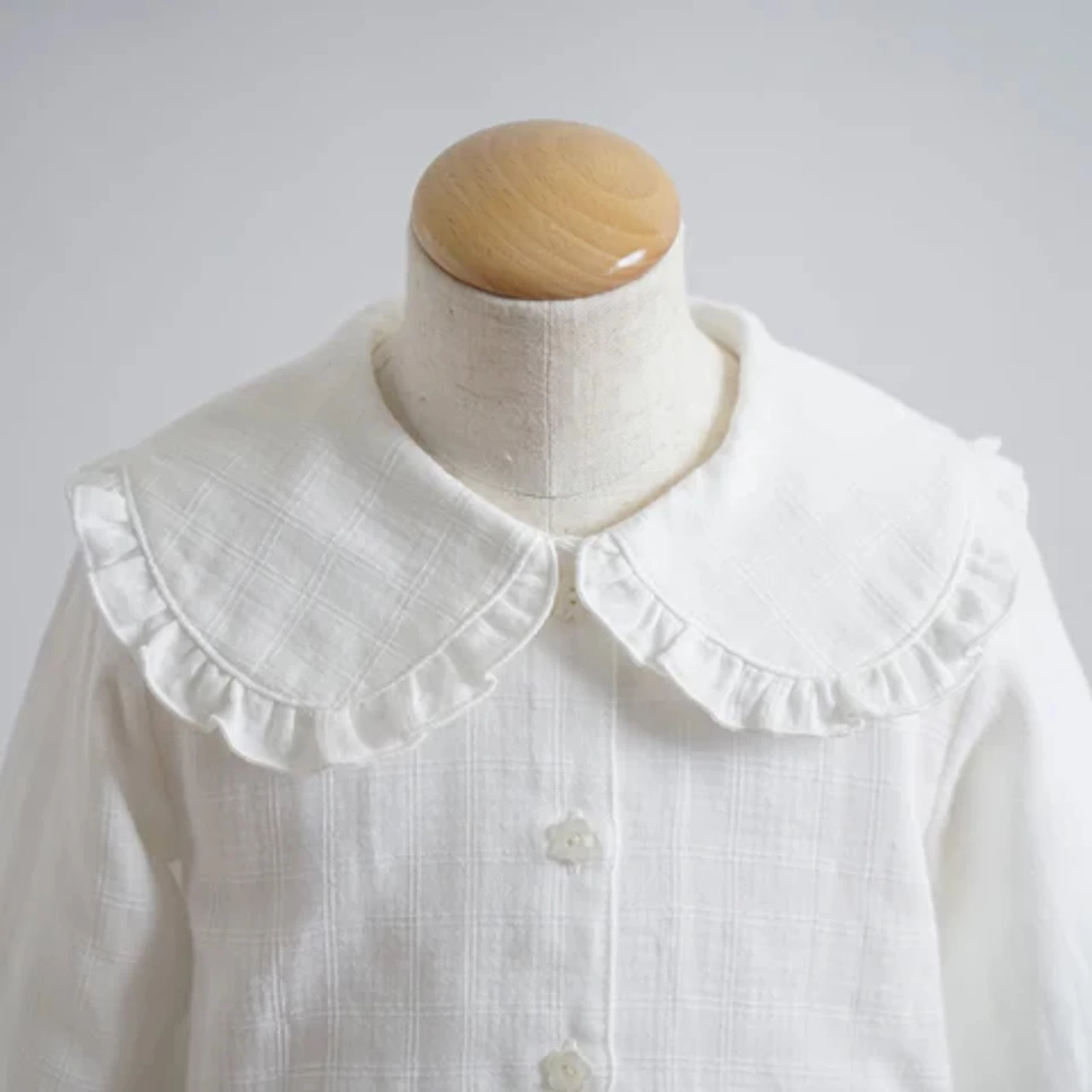 A blouse with a large frilled collar. Made out of organic cotton fabric with a check weave pattern. Frills around the collar and flower-shaped buttons make it a perfect stable for sping and summer. It is an elegant piece that can be worn for small ceremonies and special events.
