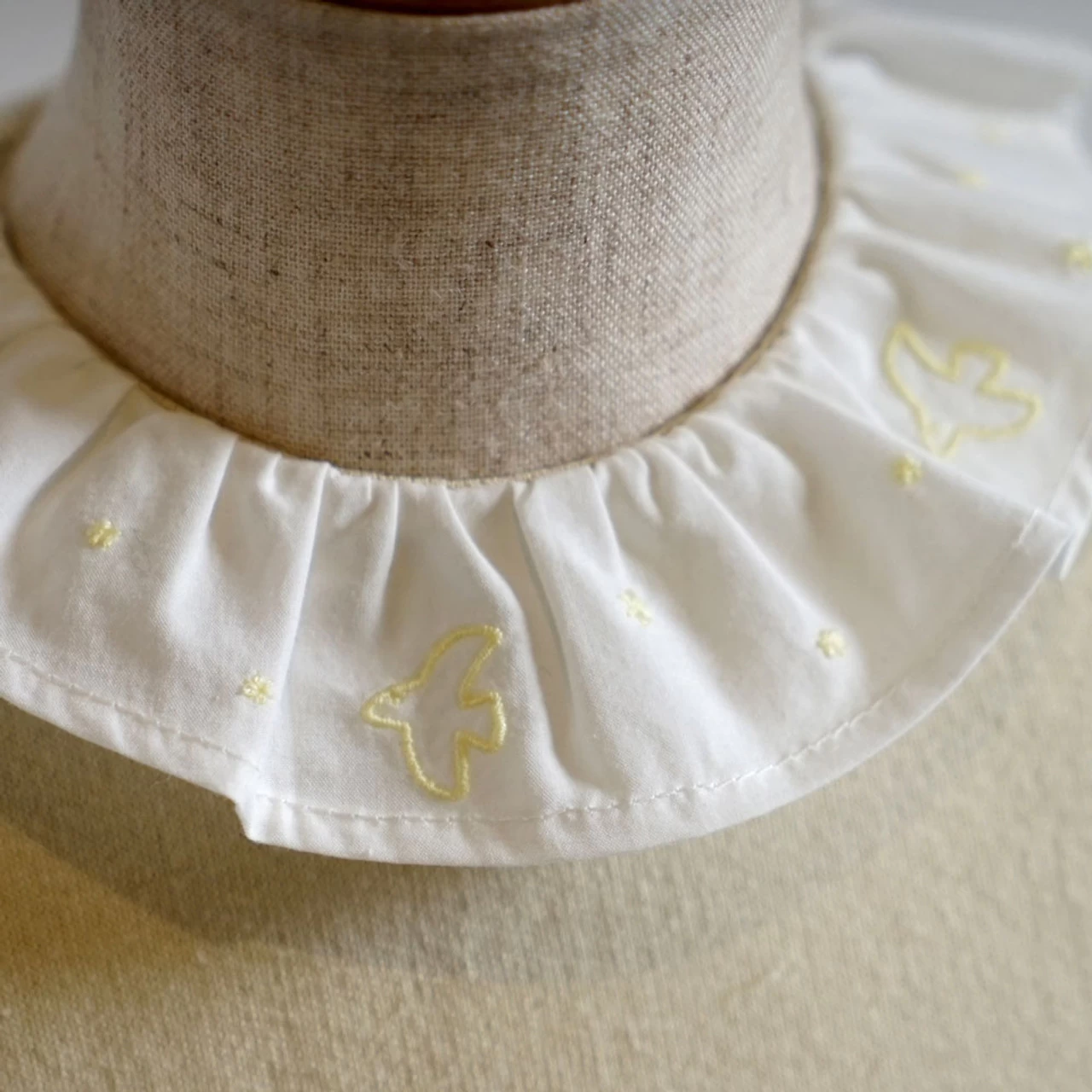 A cute top with an embroidered frilled collar with flying birds.