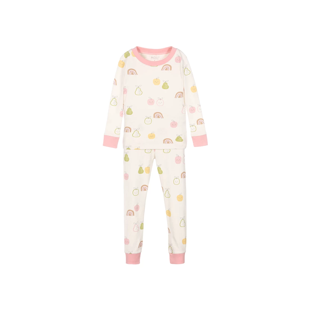 A pair of ivory pyjamas for younger girls by Kissy Love, made from super soft Pima cotton jersey. In a cute rainbow and pear print, the long-sleeved top has lightly ribbed cuffs and a rounded neckline. Designed for a snug fit, the bottoms have cuffed ankles and an elasticated waist for a comfortable night’s sleep.