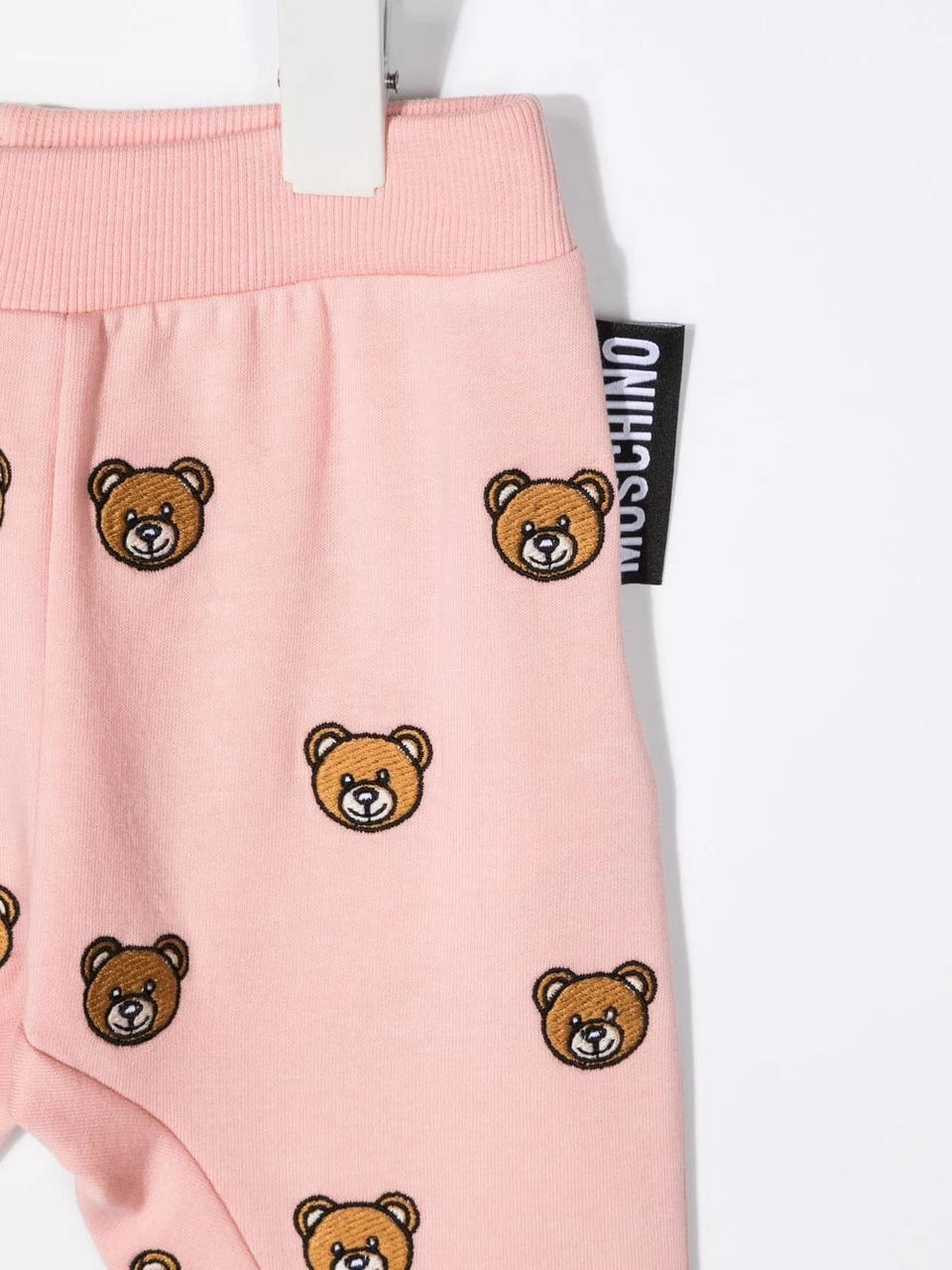 Pink stretch-cotton Teddy Bear-embroidered track trousers from MOSCHINO KIDS featuring signature Teddy Bear motif, high waist, elasticated waistband and elasticated ankles.