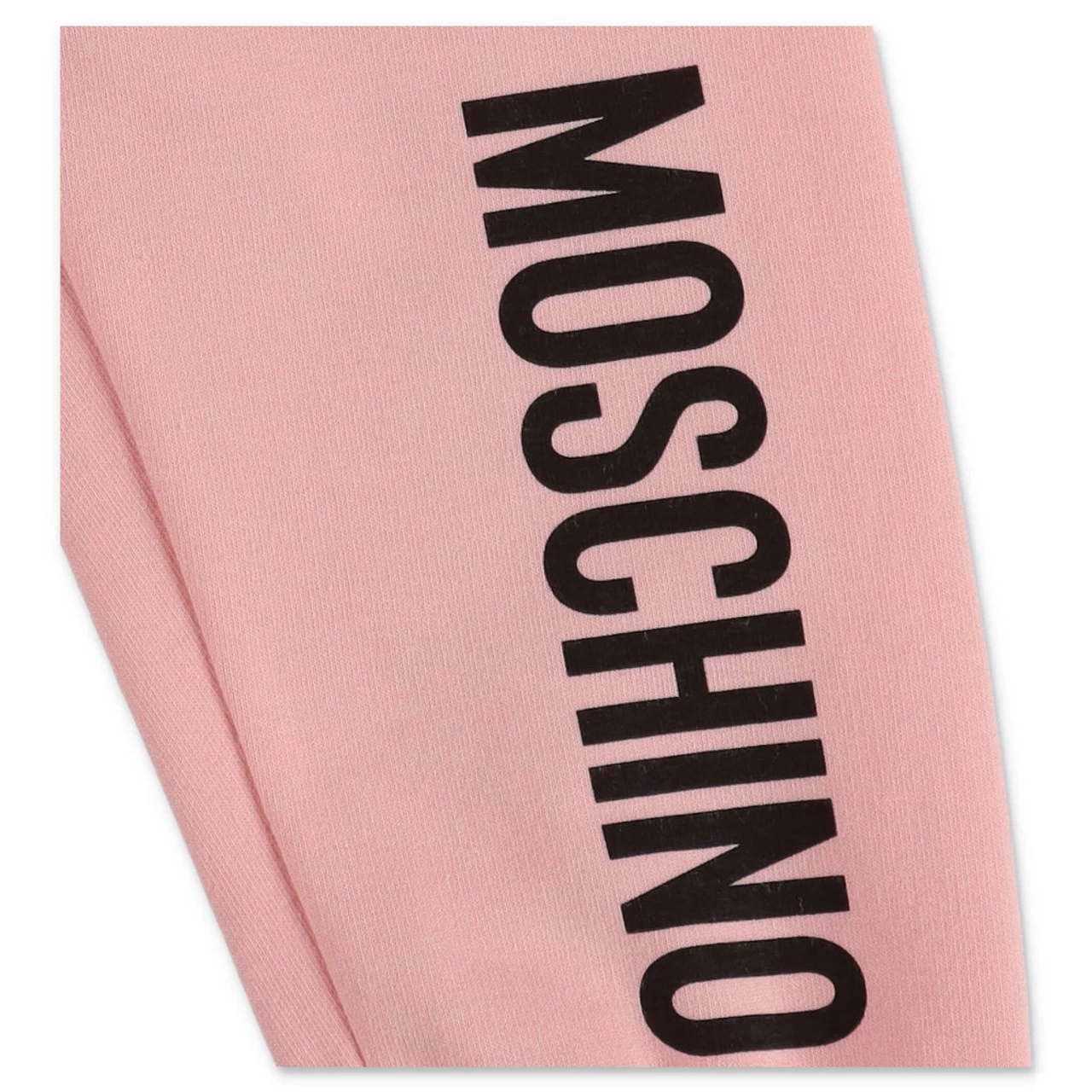 Pink joggers for little boys and girls by Moschino Kid-Teen. Made in soft lightweight sweatshirt jersey, they have a black logo print down one leg and an elasticated waistband.