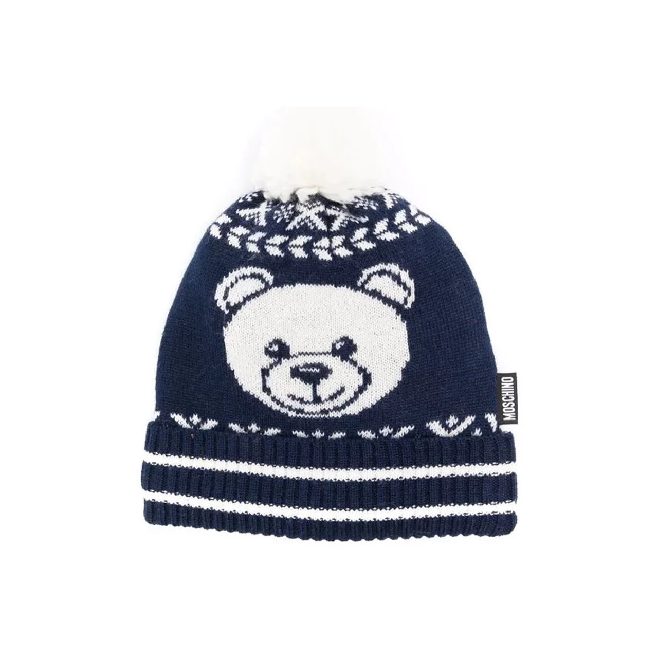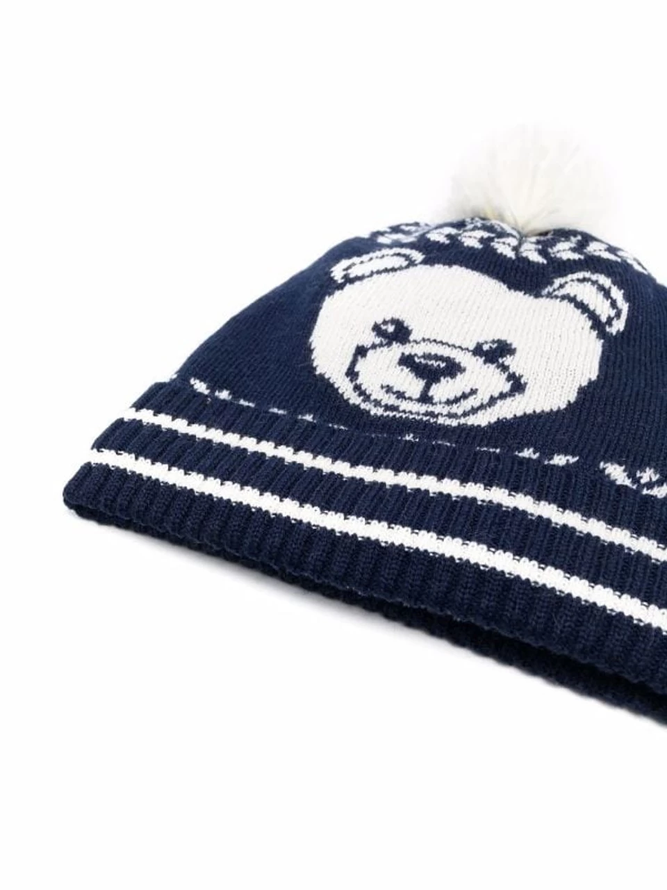 The iconic Moschino Teddy Bear is back for the new season. As seen on this blue knitted beanie, crafted from a wool-blend and decorated also with a Fair Isle motif inlay.