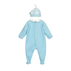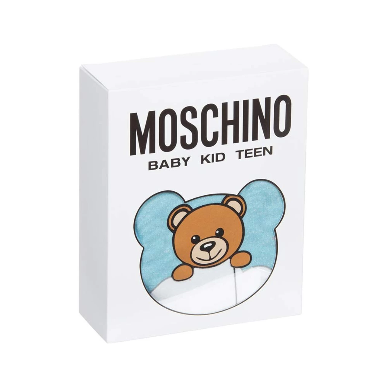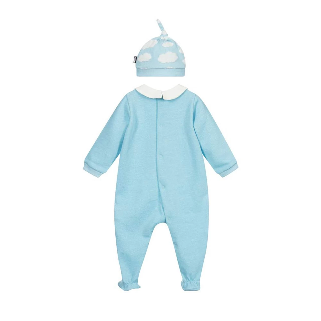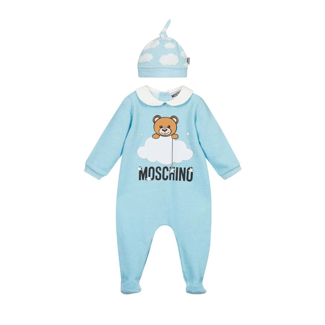 A lovely gift for boys and girls, a pale blue cotton babysuit and hat set by Moschino Baby. It is printed with the brand’s Moschino Teddy Bear logo and flocked cloud motif. This soft jersey outfit has a small white collar and jersey lined hat, with matching clouds print.