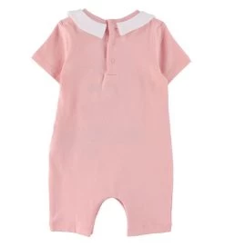 Adorable Moschino summer romper in pink with Moschino’s brown bear logo on the front. The Moschino summer romper has a nice, white collar and short sleeves and leg. The suit is opens at the neck and between the legs with push buttons. The suit comes in a beautiful gift box.