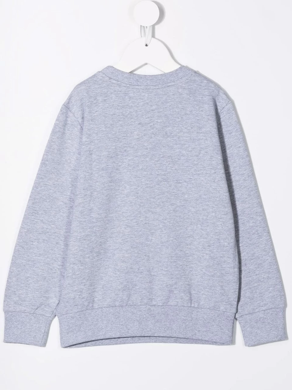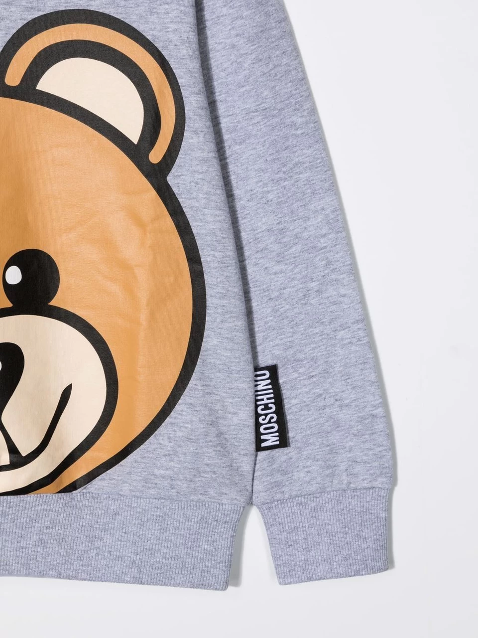 Grey regular fit sweatshirt by Moschino Kids made of cotton and characterized by ribbed round neck, long sleeves, straight hem, label logo on the side and maxi Teddy Bear print on the front. Size range: Age kid clothing