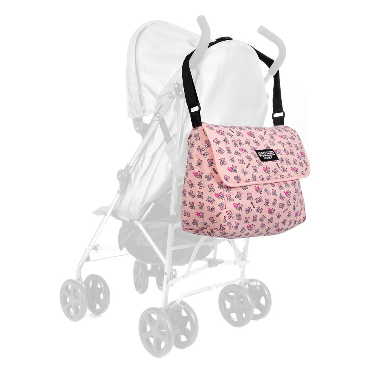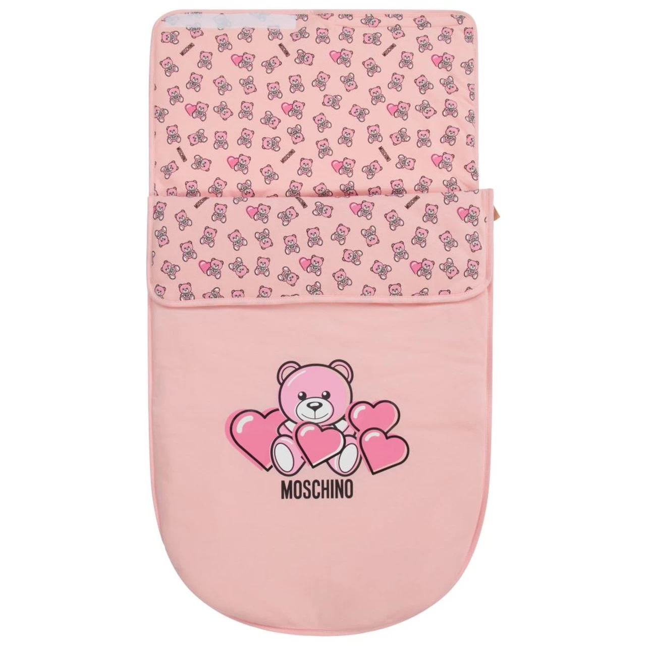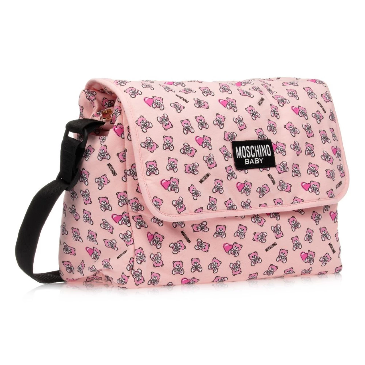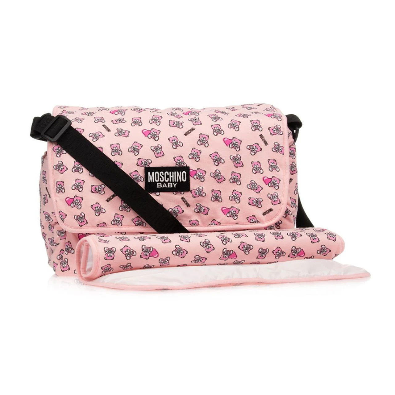 Unstructured, lightly padded pink changing bag by Moschino Baby, patterned with pink Moschino Teddy Bears. It is made in soft cotton jersey and comes with a matching changing mat. The zip-fastening main compartment has a velcro-fastening flap with a black and white logo appliqué, and a waterproof lining. The bag has internal and external pockets, with an adjustable black shoulder strap.