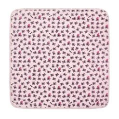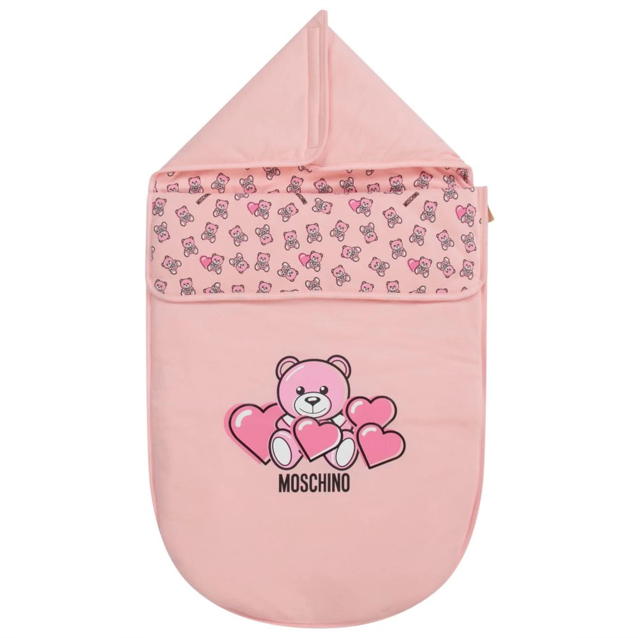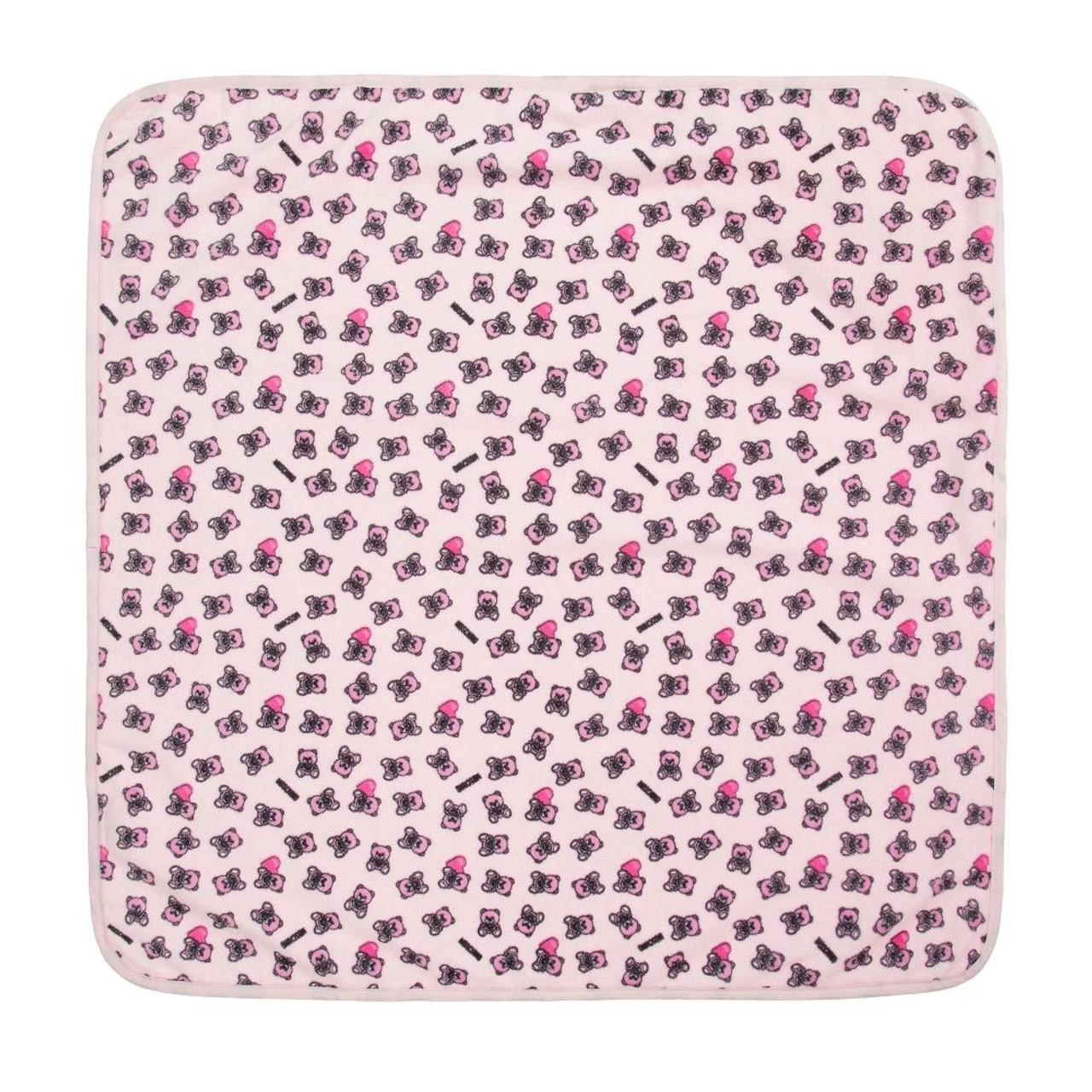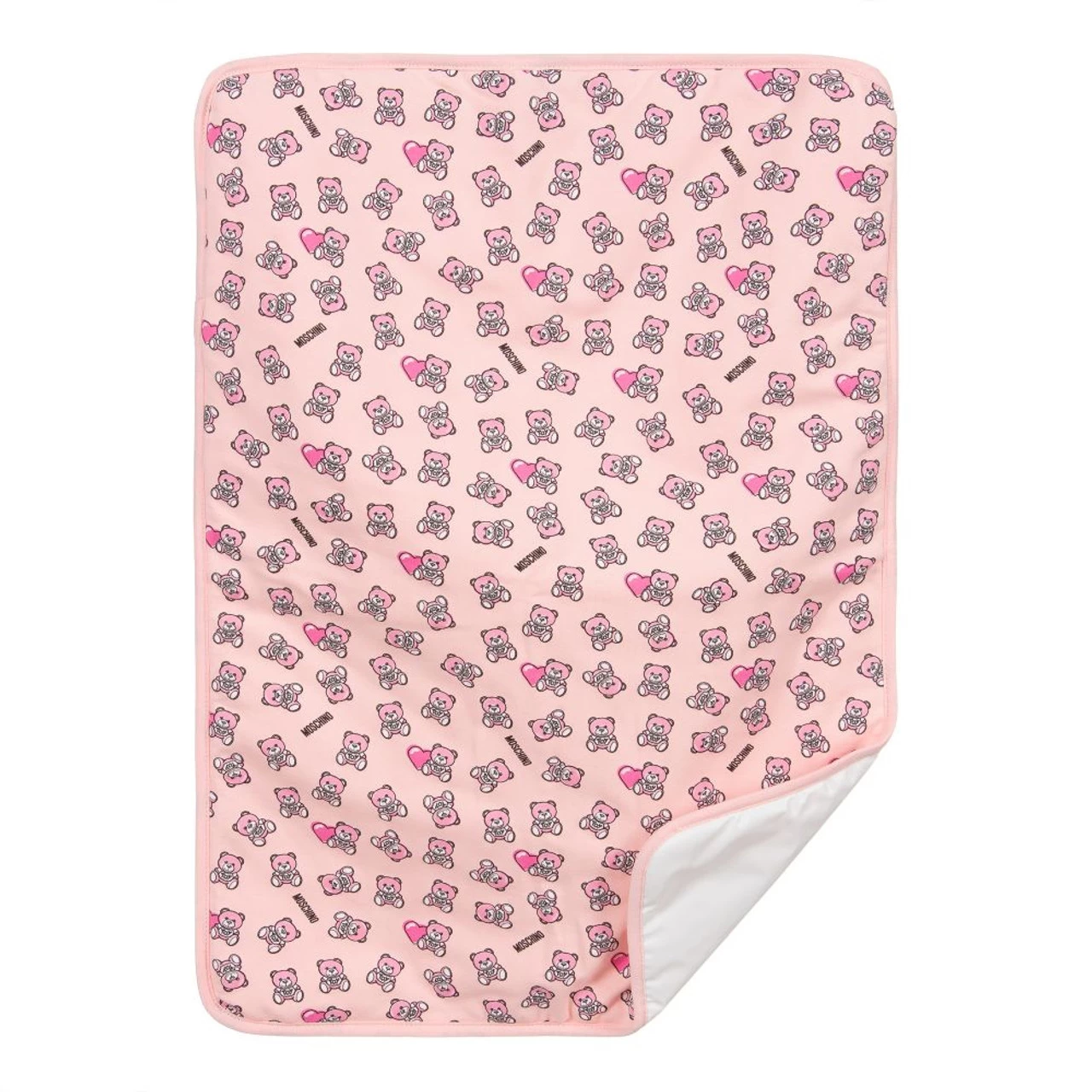 Unstructured, lightly padded pink changing bag by Moschino Baby, patterned with pink Moschino Teddy Bears. It is made in soft cotton jersey and comes with a matching changing mat. The zip-fastening main compartment has a velcro-fastening flap with a black and white logo appliqué, and a waterproof lining. The bag has internal and external pockets, with an adjustable black shoulder strap.
