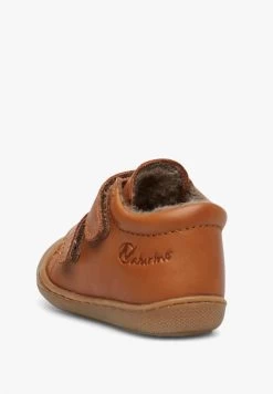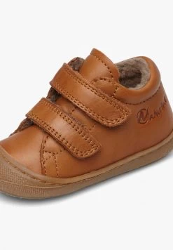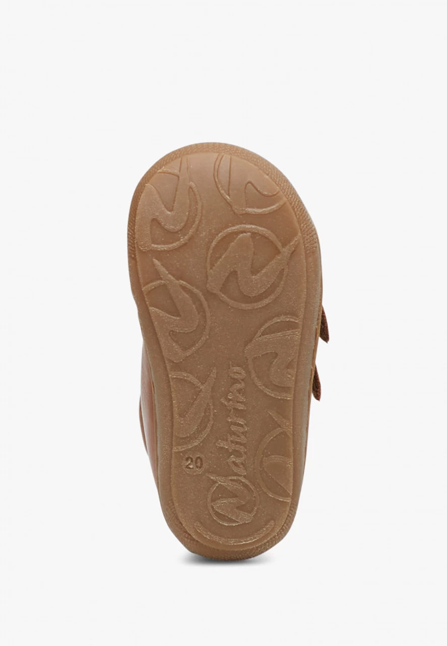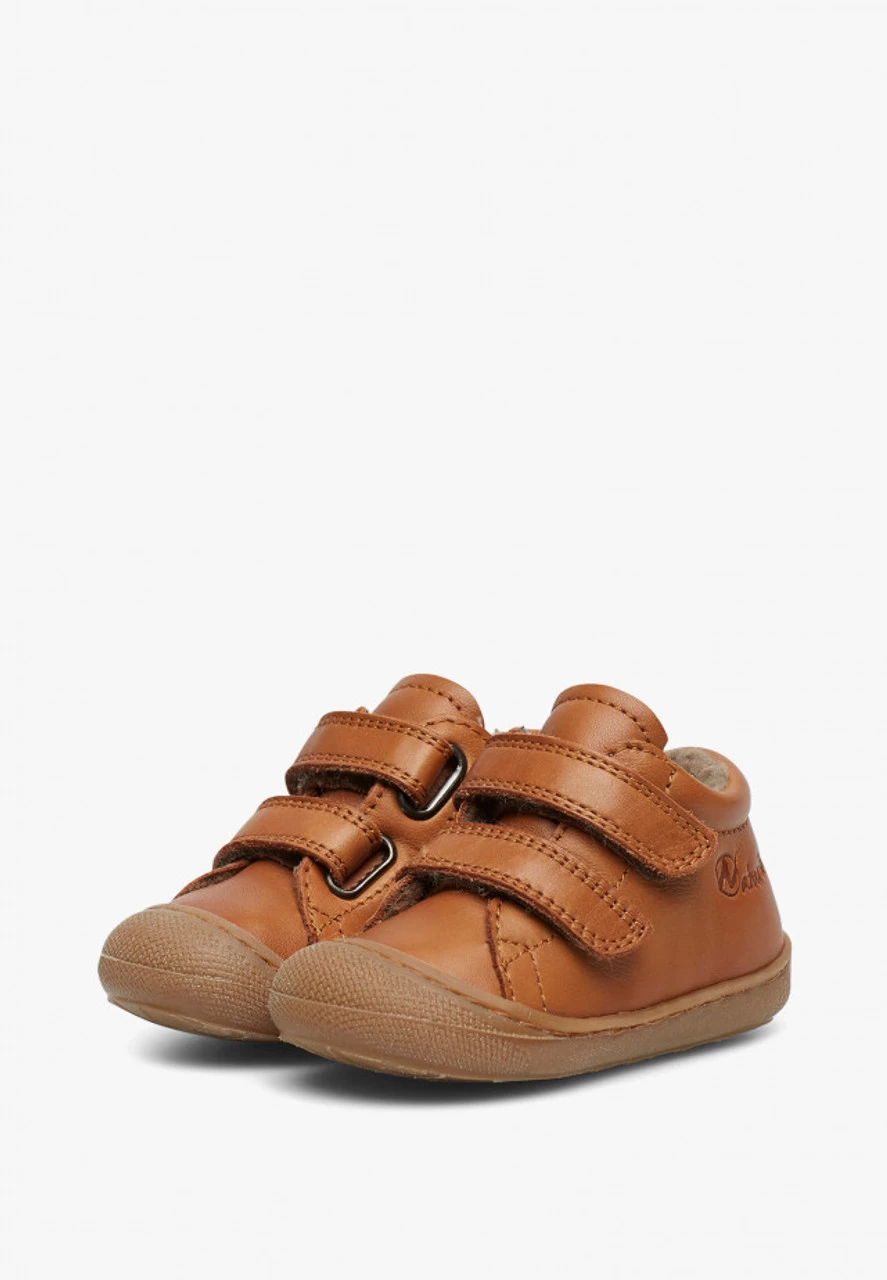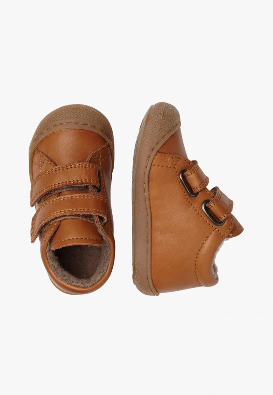 Ultra-soft cognac first-steps shoes with double Velcro straps and woollen linings. Light flexible rubber bottoms and reinforced toe make these shoes perfect for children who are learning to crawl and take their first steps.