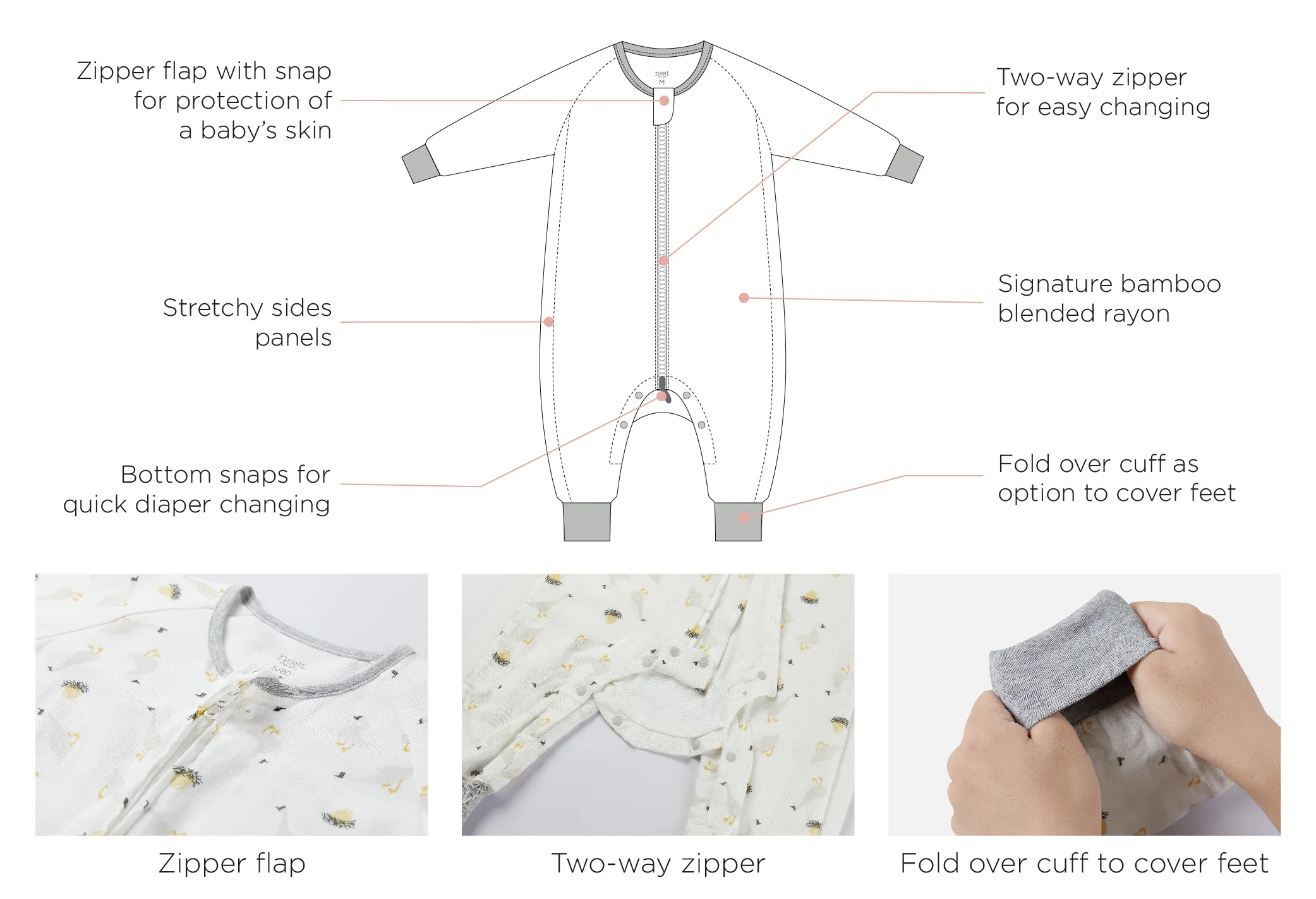 - Snaps all the way to the feet for easy diaper changes