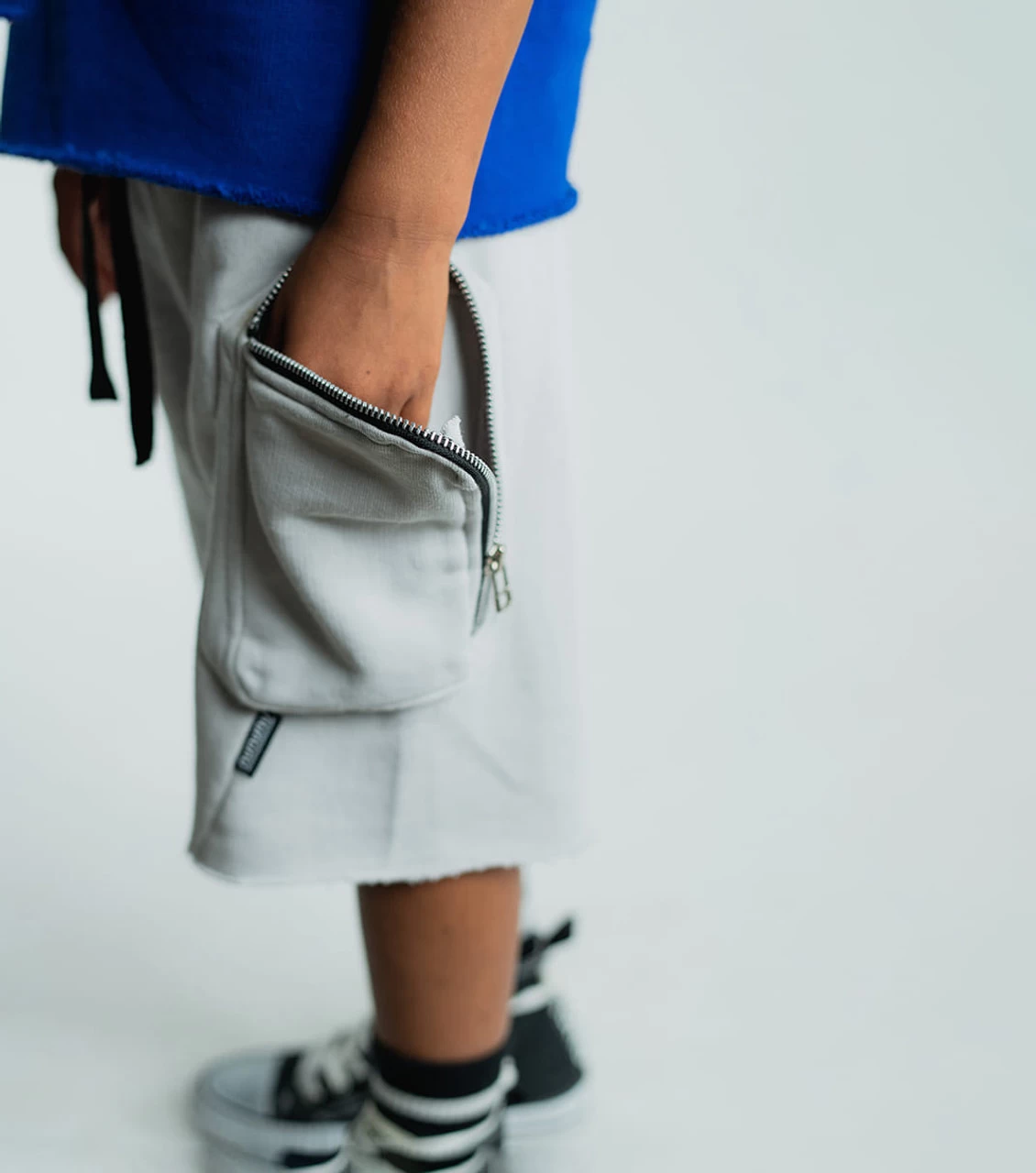 Seems impossible for a pair of ice grey shorts to be a total style coup, but here we are. Long & exaggerated in shape, these comfy french terry cargo-style shorts have a big-ass zip pocket on one leg & an oversized butt pocket too. Slash seams only add to the audacious dopeness of an amazing summer wardrobe staple. An elastic drawstring waist means you can easily throw ‘em on with swimsuits, tank tops, tees & literally anything else. Prepare to own the summer