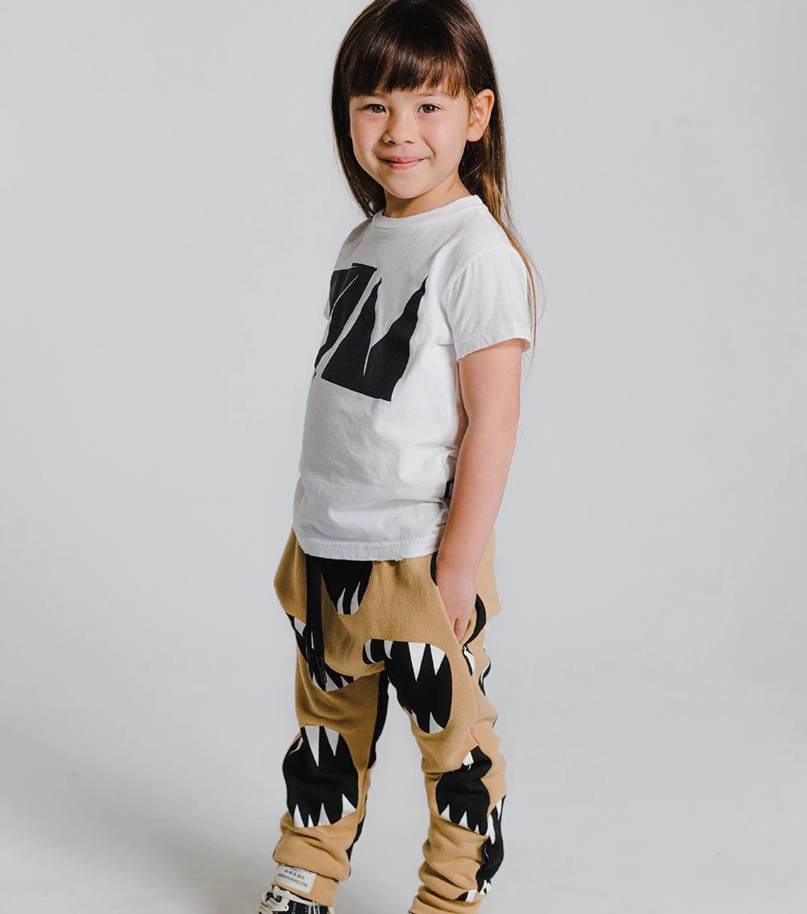The new design represents the roar of a new generation, fangs & all. rawwr! here, the rounded oblong graphic appears all over this classic nununu item, our baggy pants for boys & girls in delicious mocha. comfortable as hell in our soft cotton, they’re roomy & slouchy, giving legs the freedom, they need to run, play & perhaps even sit still at times.