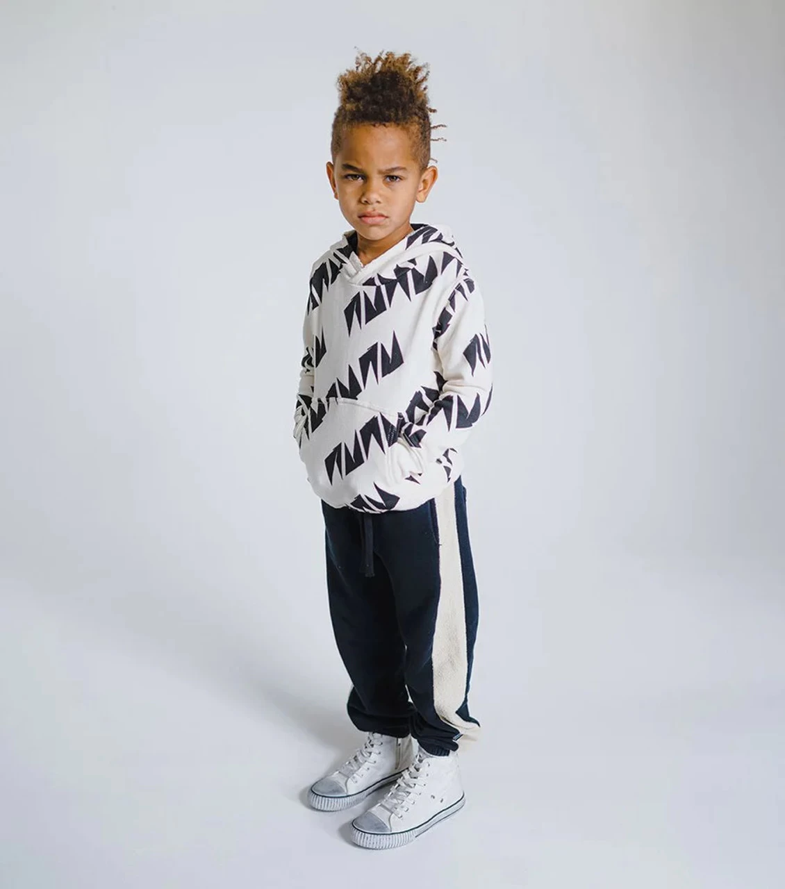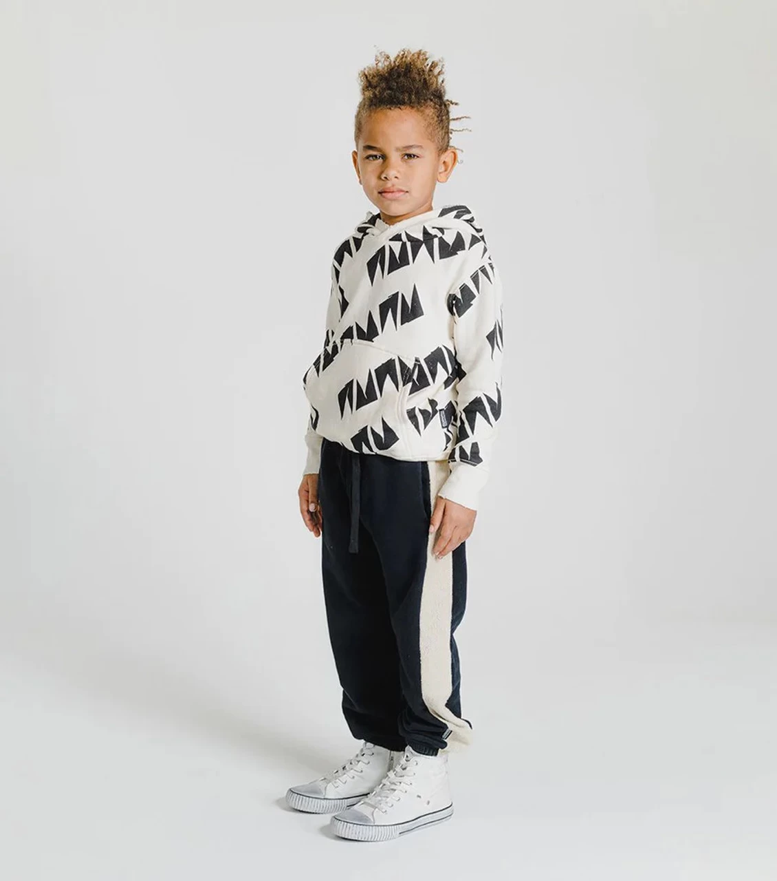It’s always cool to add textural interest to a perfect basic. these black baggy pants have that classic nununu shape & french terry feel, with a little bit of action on the side. colorblock panels run the length of the leg in contrasting inside-out terry for a fuzzy towel-like effect. elastic cuffs & drawstring waist keep this look tight (literally).