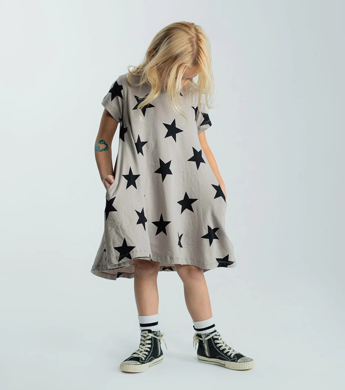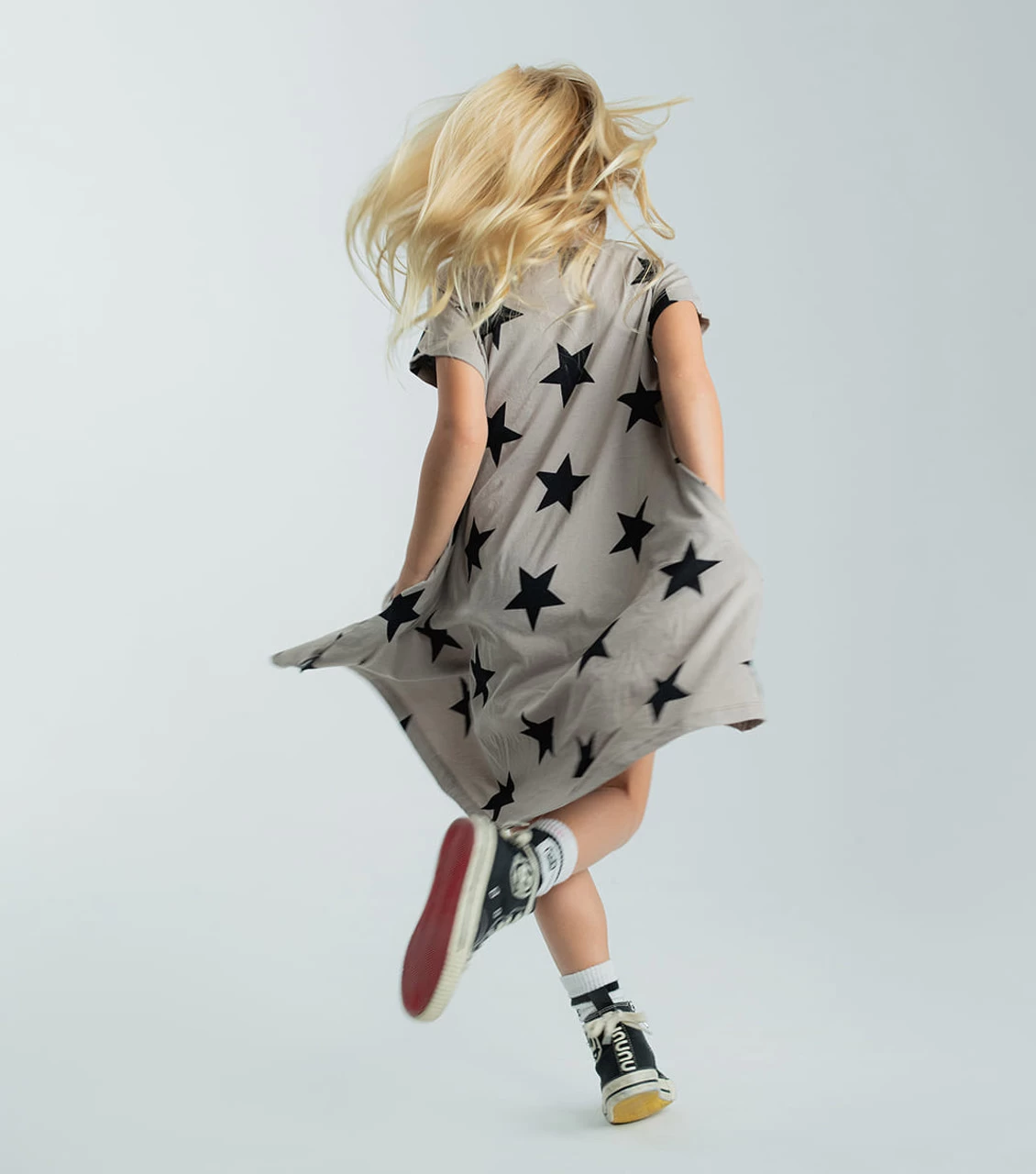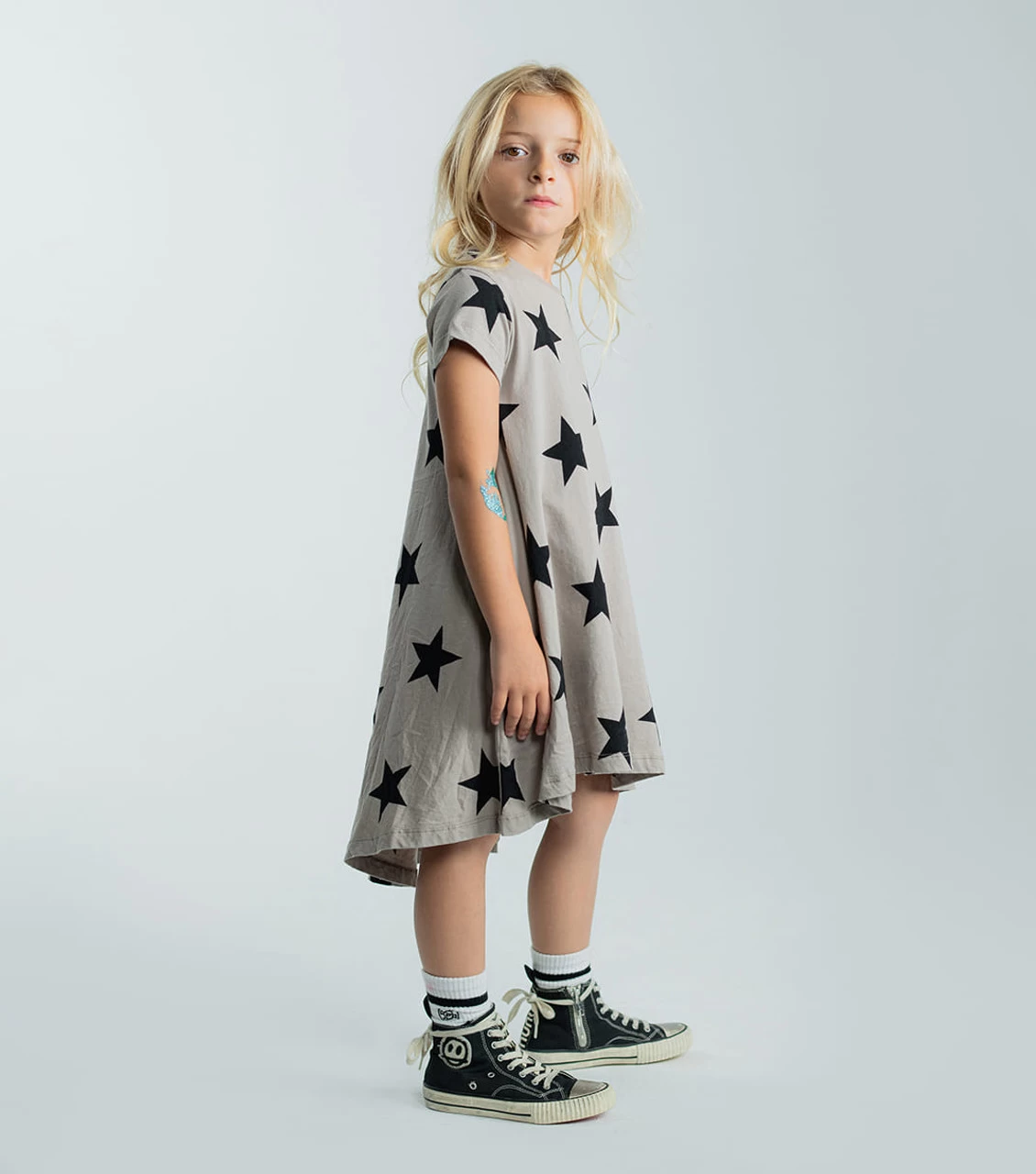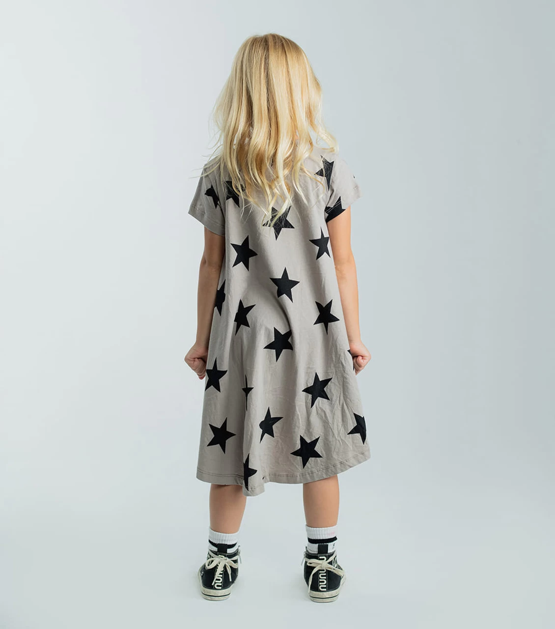 Our signature star print is the perfect complement to this short-sleeve, drapey 360° dress in stone. Good for twirling around town, it’s longer in back for a hi-lo feel, but never bulky—super comfy for an all-day look. A beloved nununu classic.