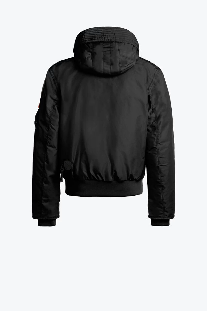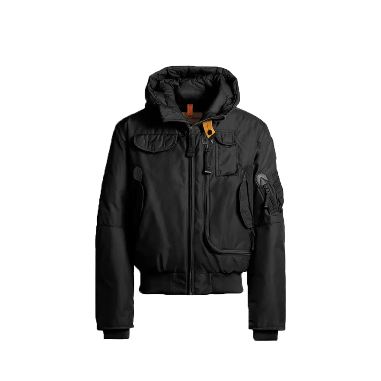 Hooded bomber with a removable down-filled lining and crafted in recycled nylon oxford with fabric protector treatment and inner polyurethane lamination. Taped seams on hood, shoulders and armholes. Multiple pockets include a capacious cargo pocket in front, containing a mesh pocket, as well as one inner zippered pocket and a pocket on the left sleeve. Reinforced patches at the elbows. Ribbed cuffs and bottom. Front zipper. Iconic yellow elastic strap neck closure and PJS patch on left sleeve.