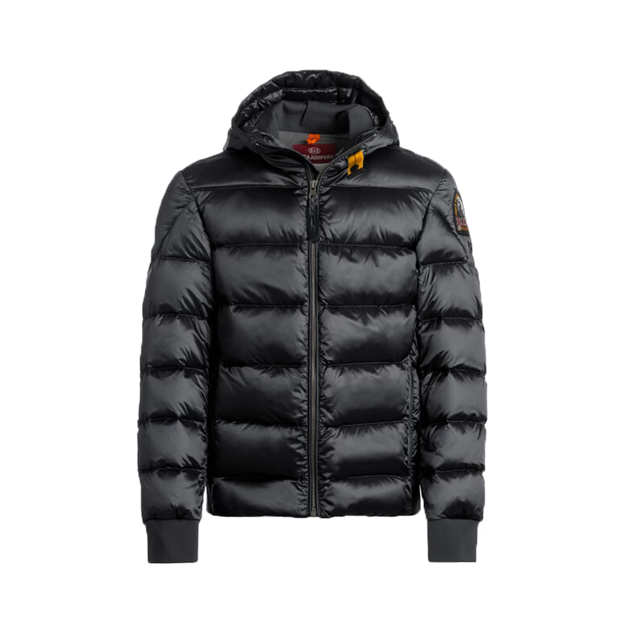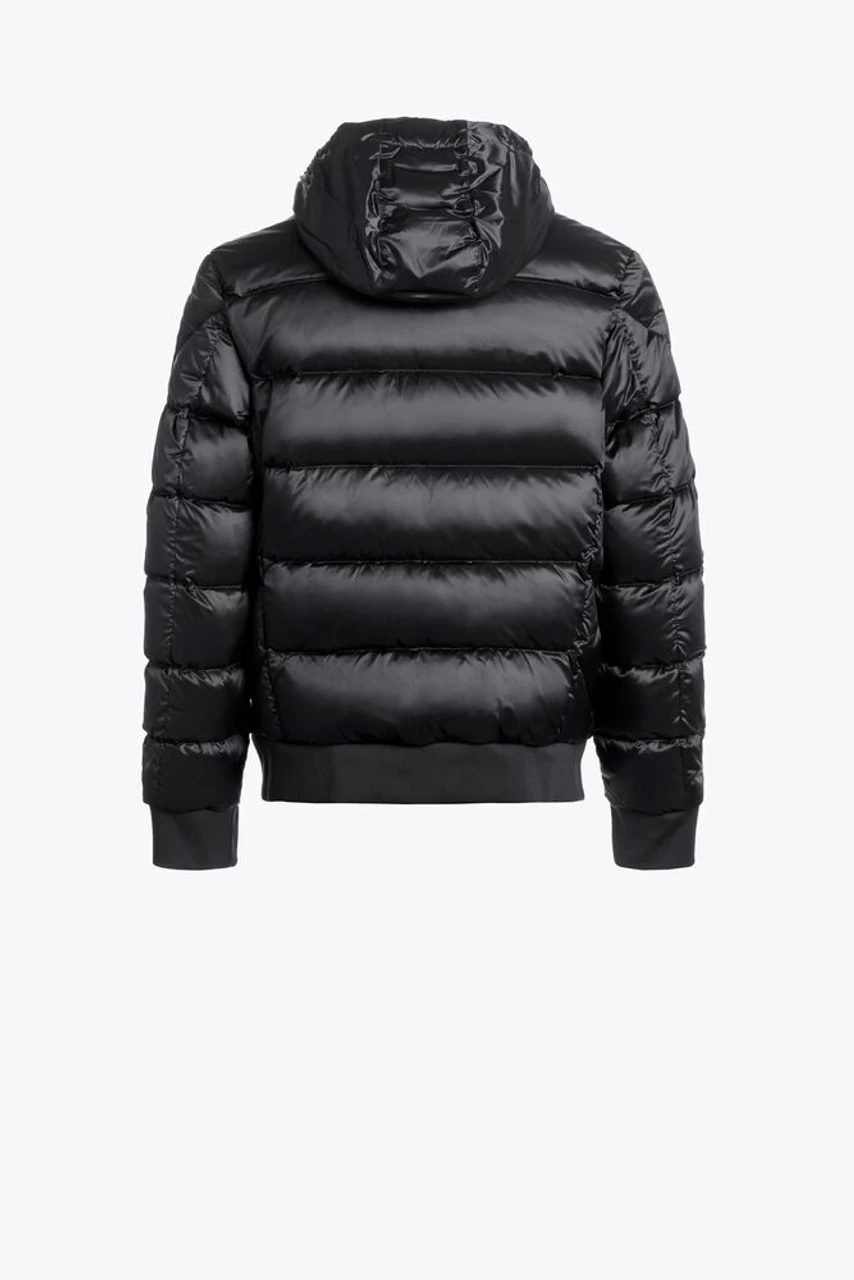 Hooded down-filled 20 den polyester-nylon twill bomber. Two zippered pockets in front and one pocket on the inside. Front zipper and underarm vents. Ribbed cuffs and bottom. Iconic yellow elastic strap neck closure and PJS patch on the left sleeve.