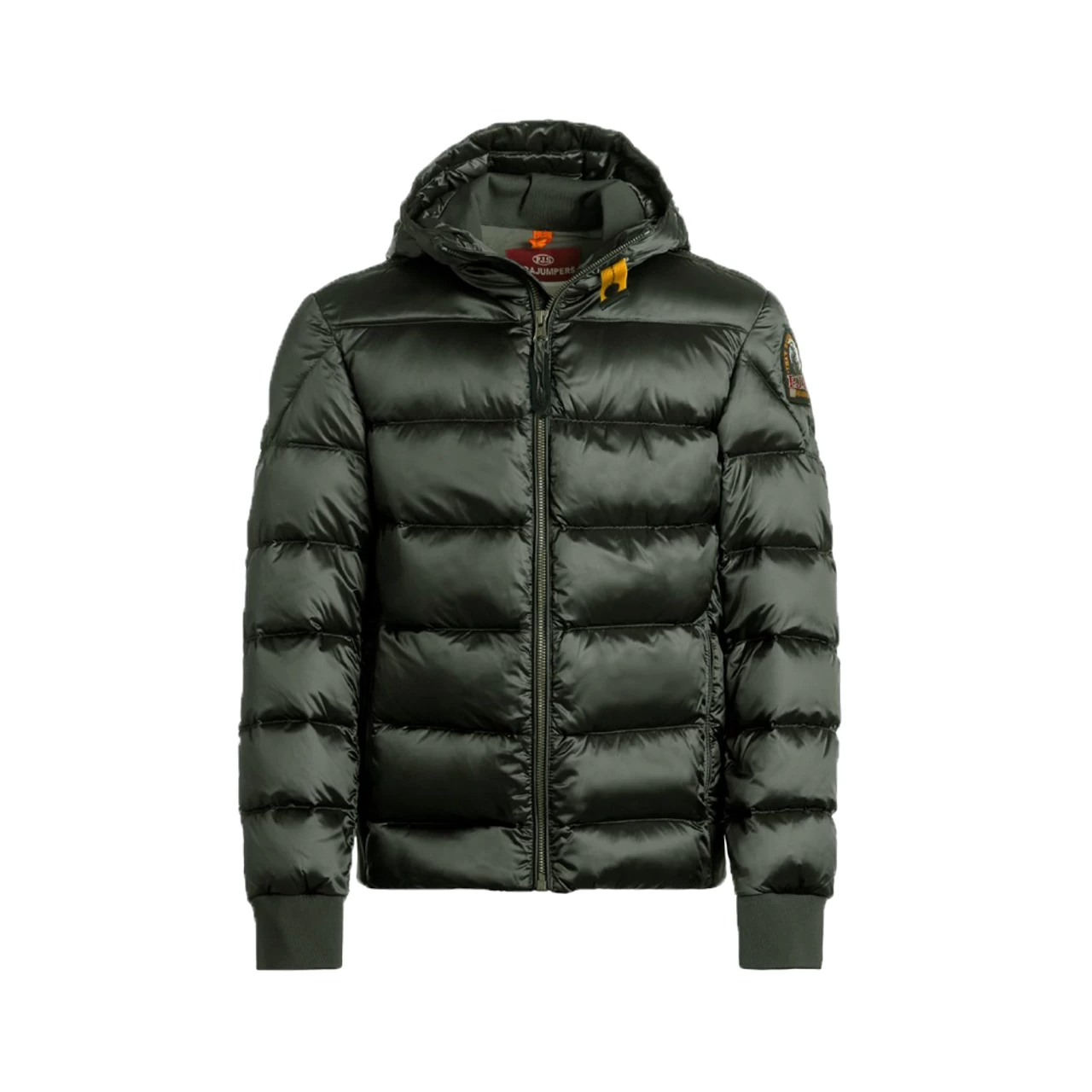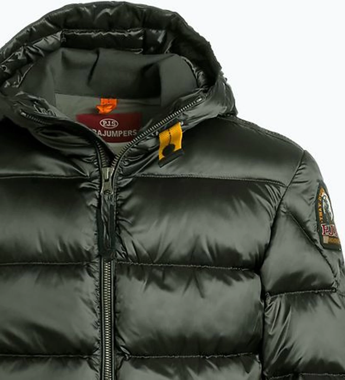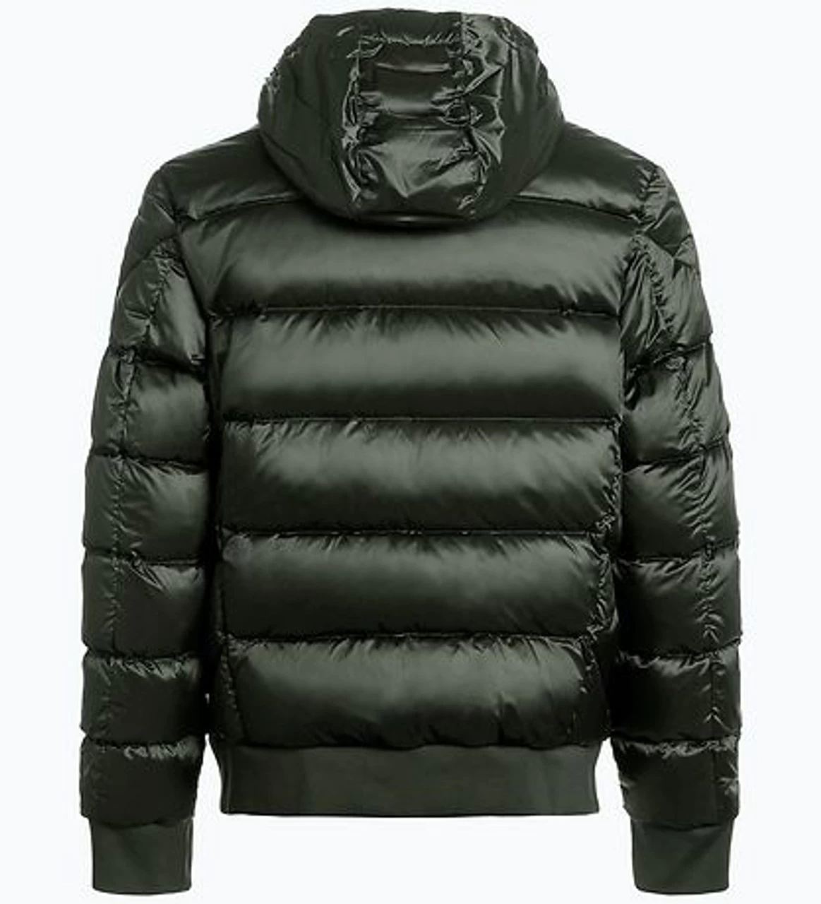 Smart Parajumpers down jacket in army green in a smooth woven quality and with horizontal seams. At the top of the left sleeve is a black mark with a logo.