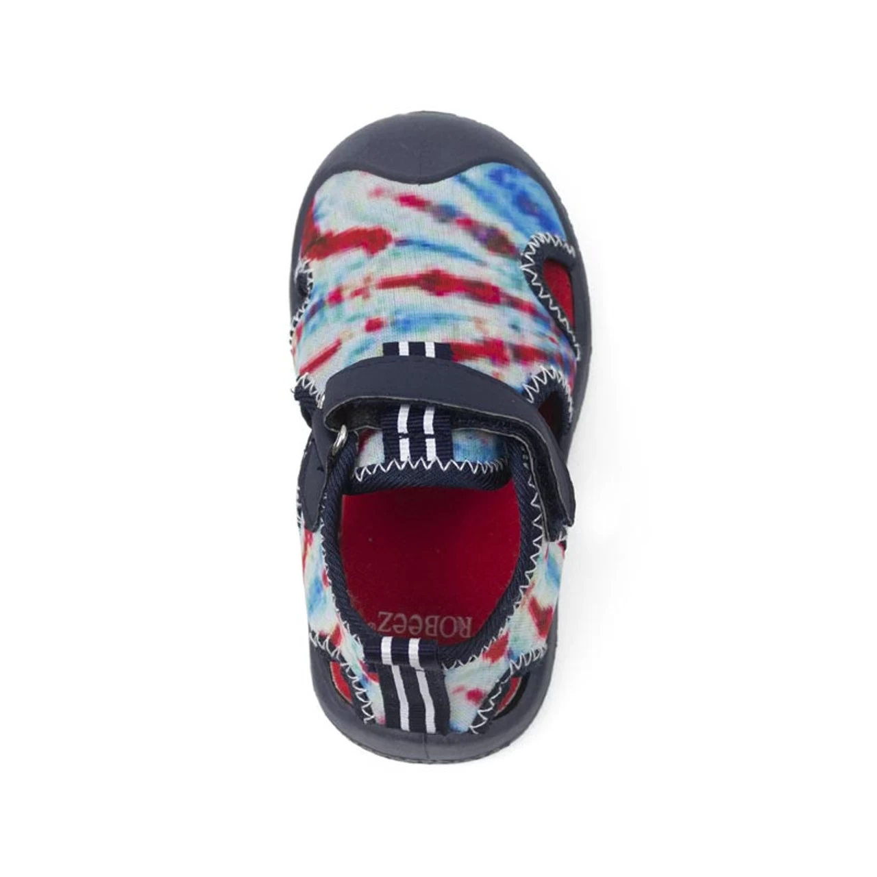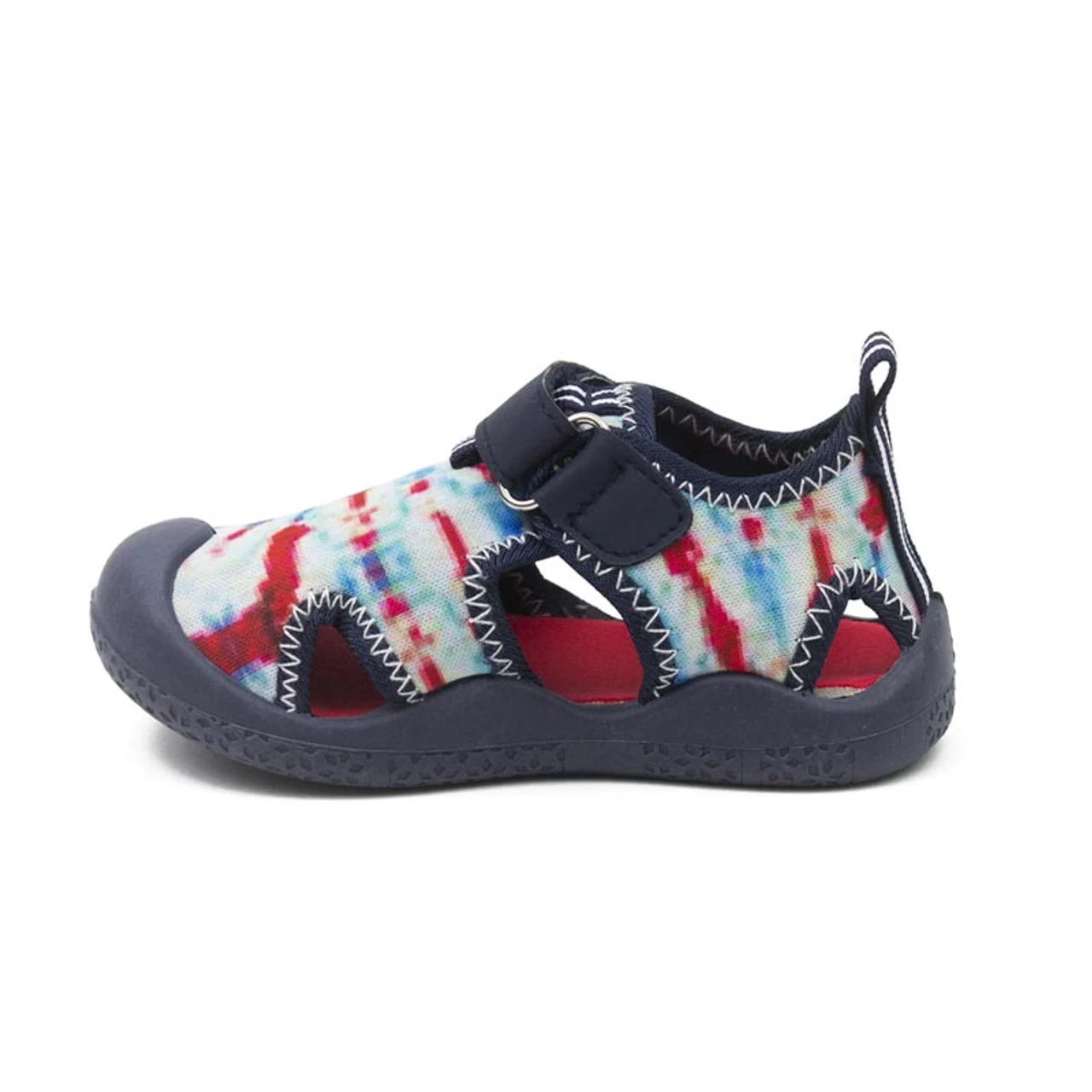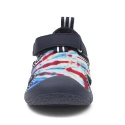 Red neoprene, tie dye print with navy pop details. Closure is hook and loop adjustable strap. Easy on/stay on functionality with flexible, cushioned insole & split rubber outsole to provide extra comfort & protection for little feet.