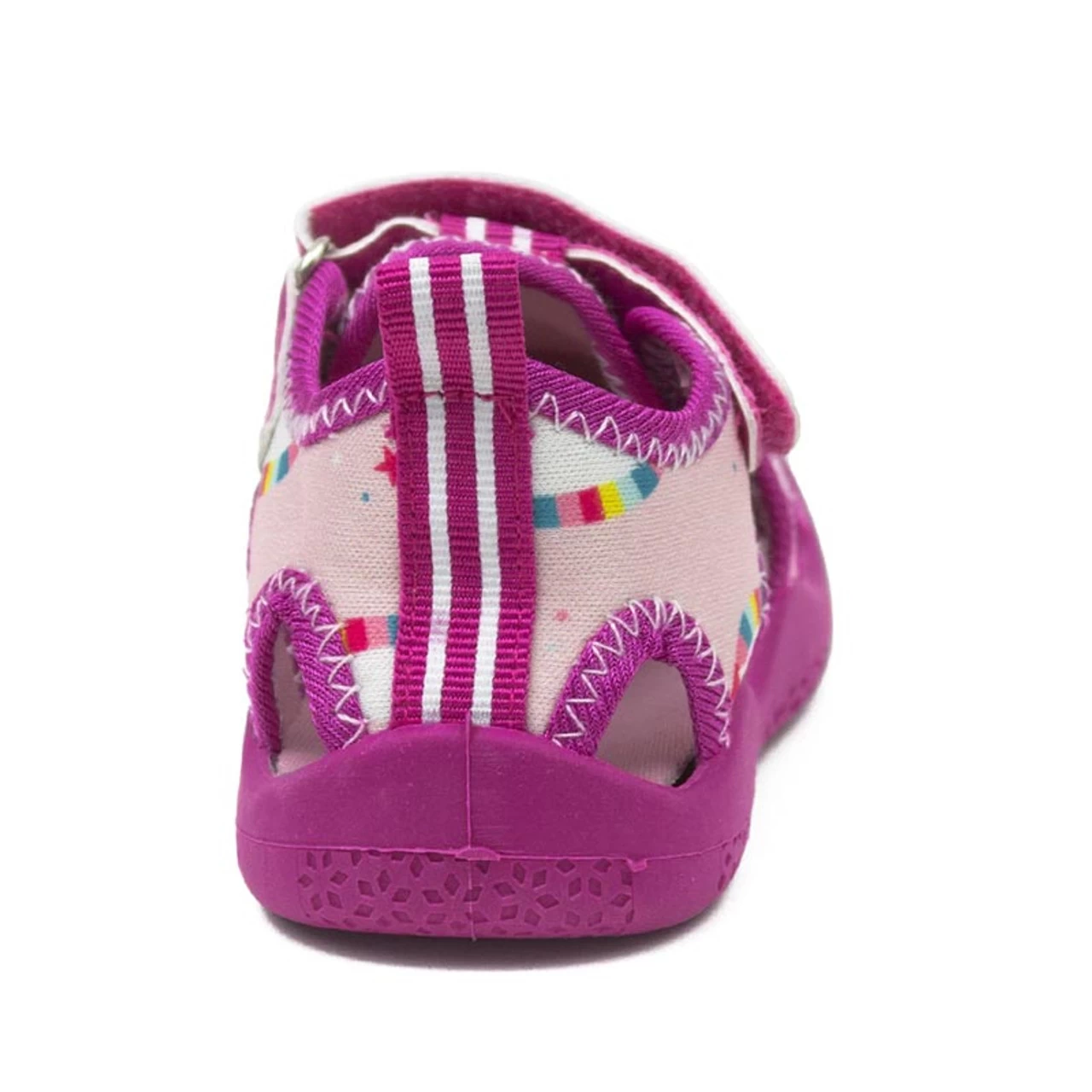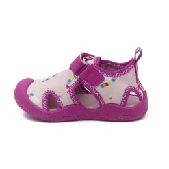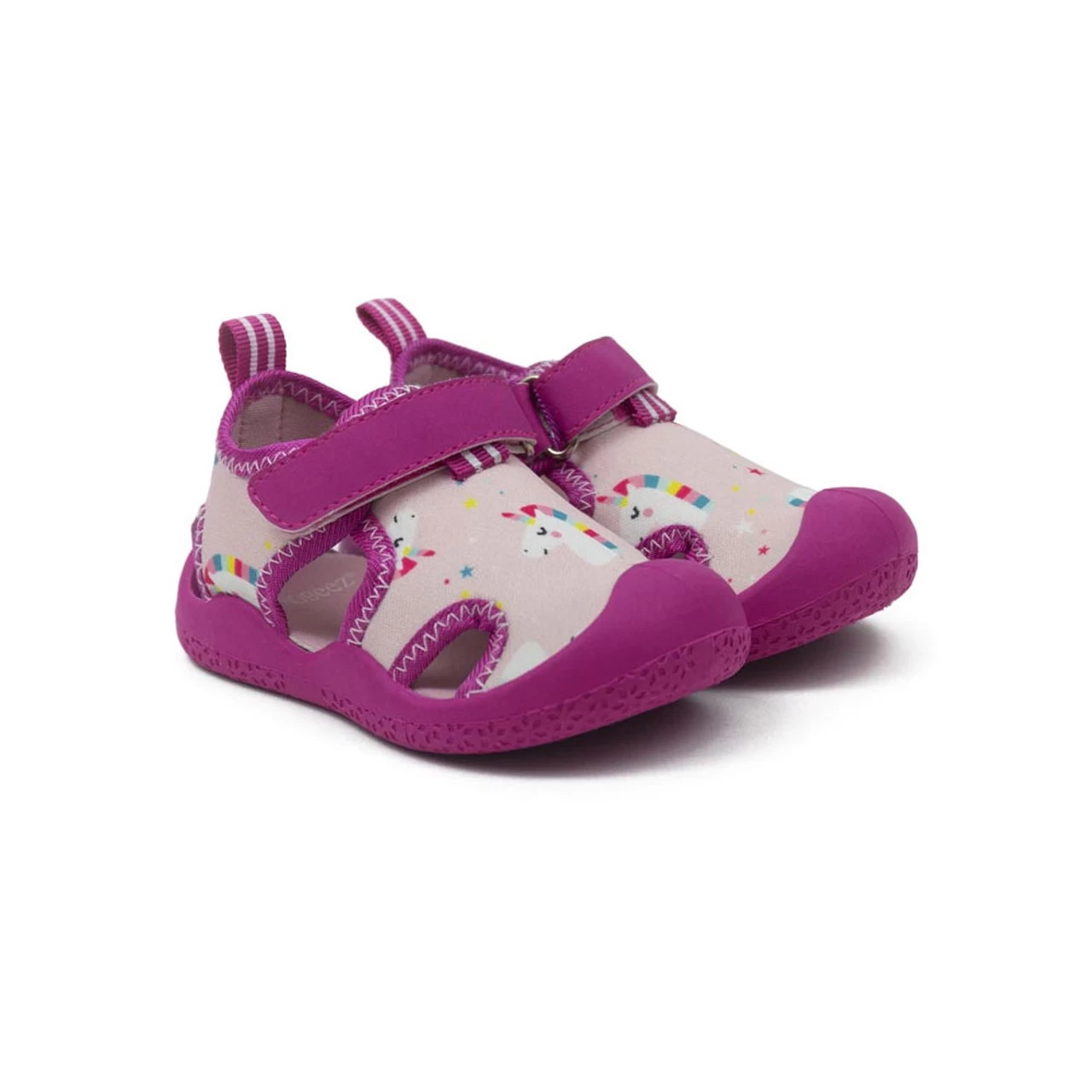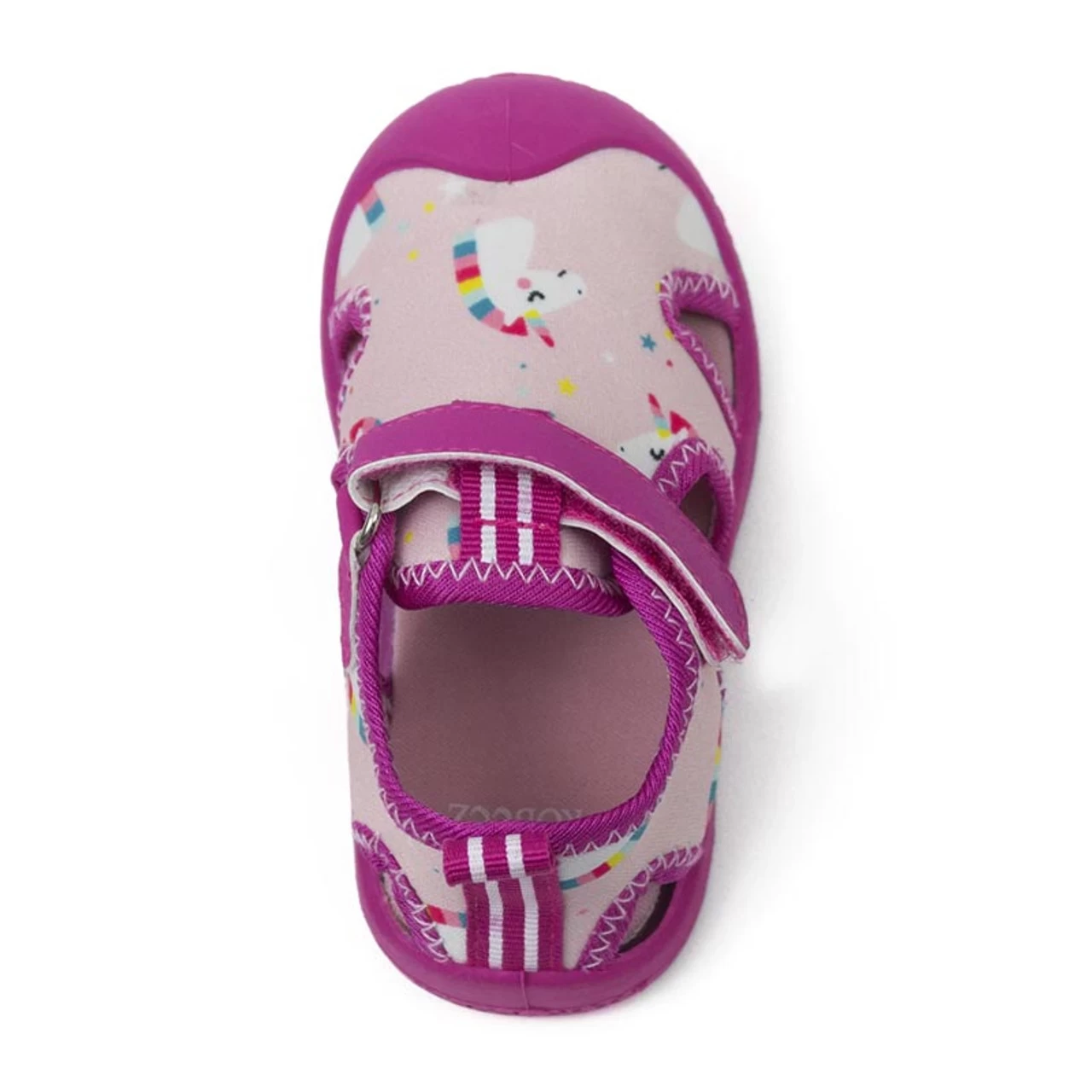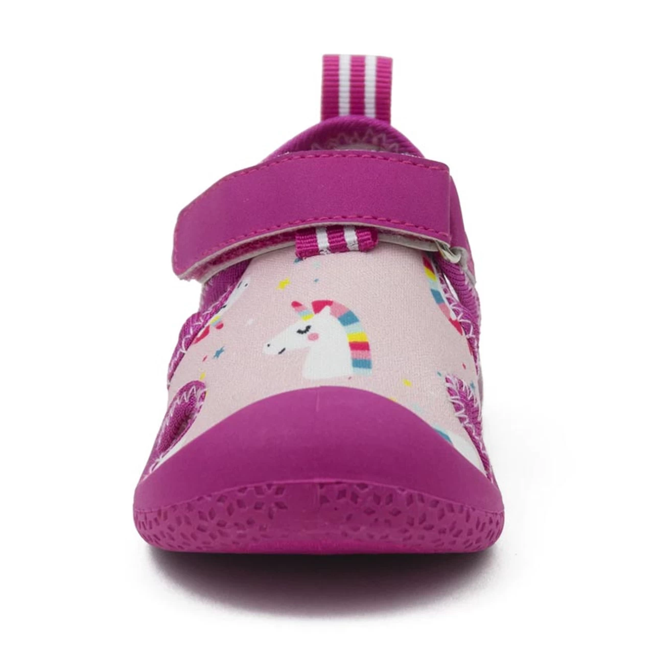Pink neoprene, unicorn print with bright pink pop details. Closure is hook and loop adjustable strap. Easy on/stay on functionality with flexible, cushioned insole & split rubber outsole to provide extra comfort & protection for little feet.