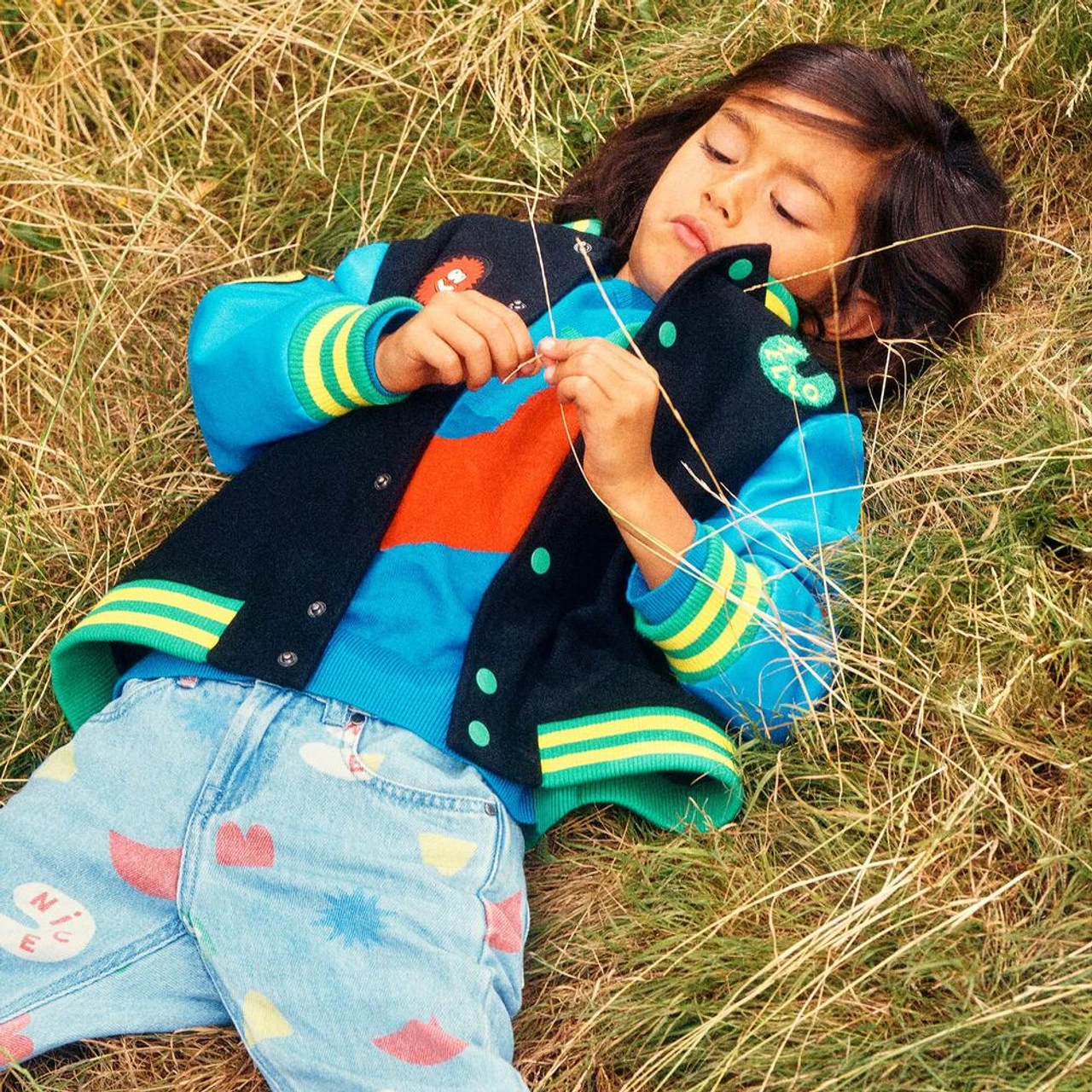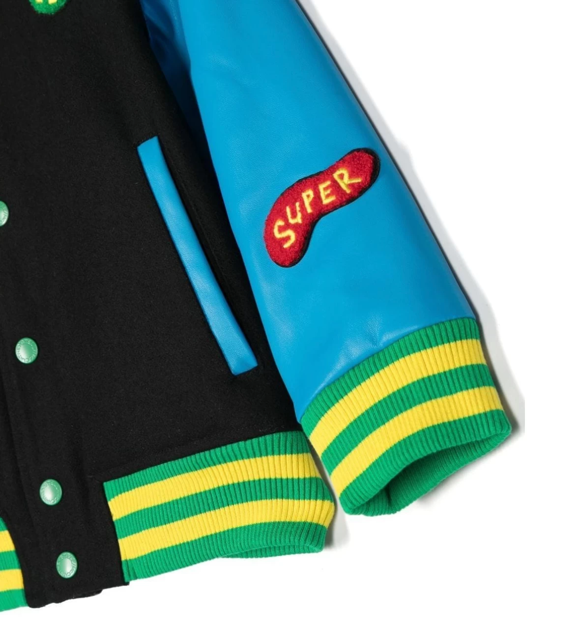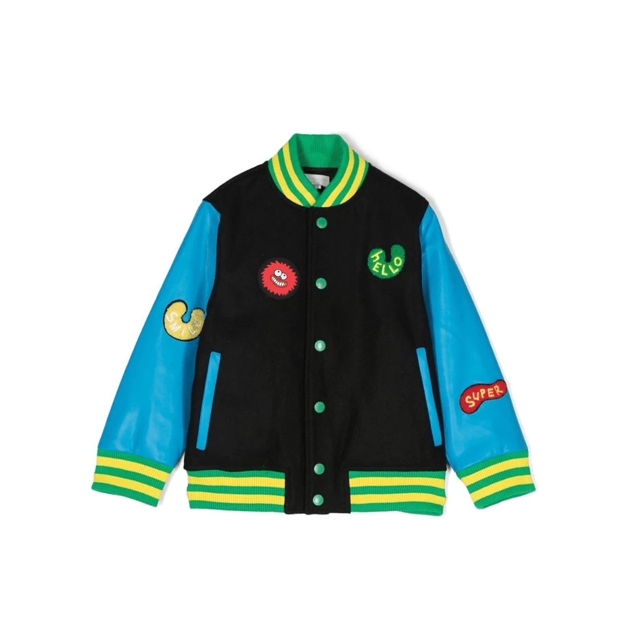 Funky jacket for boys from Stella McCartney Kids, made from black felted wool blend with blue faux leather sleeves. This eye-catching jacket has colourful rubberised patches of abstract character shapes and a bouclé patch with ‘hello’ embroidered on it. The bright ribbed trims and green popper fastenings give an alternative finish to this fun piece.