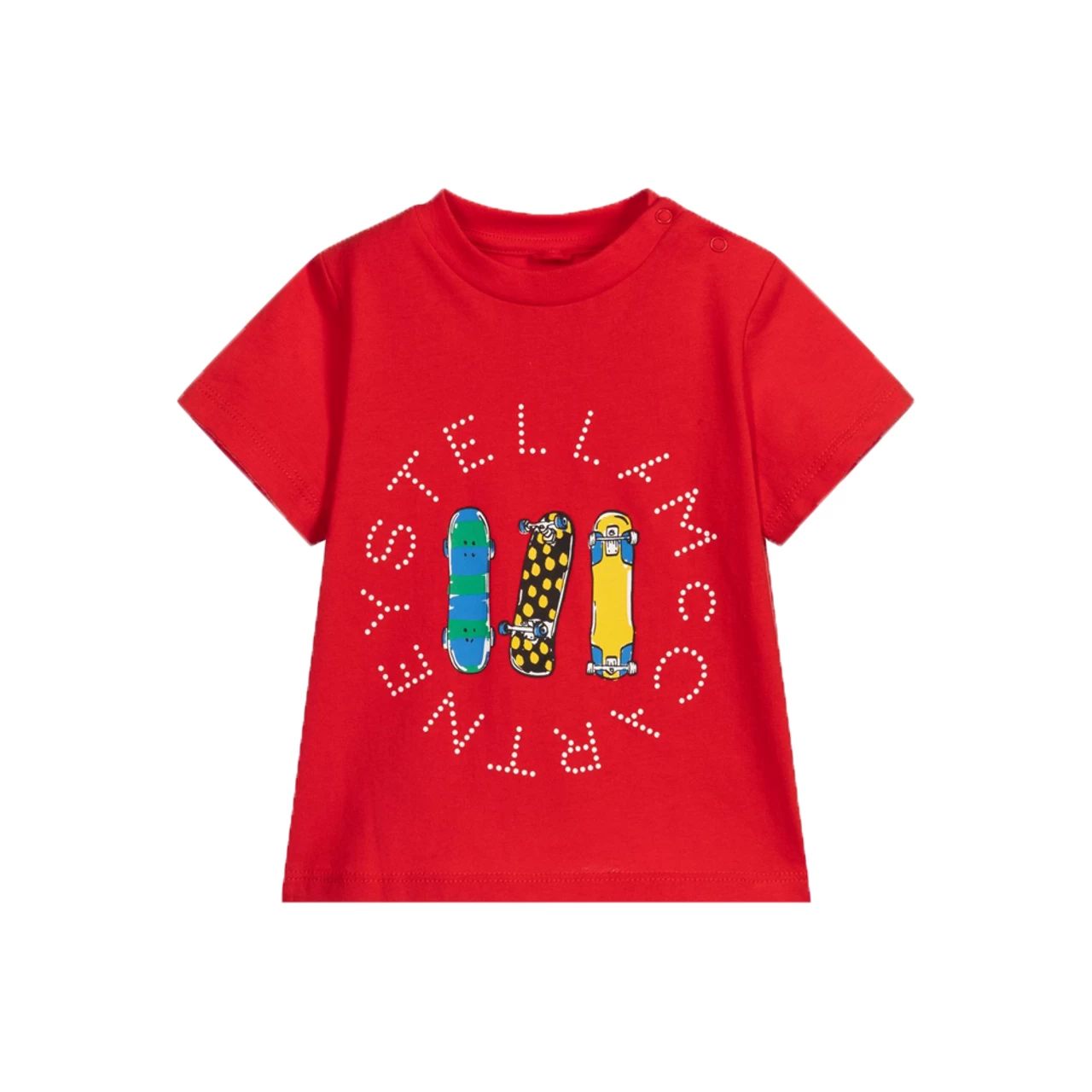 Soft red organic cotton jersey T-shirt for little boys by Stella McCartney Kids. The front has a colourful skateboard logo print, with popper fastening on the shoulder.