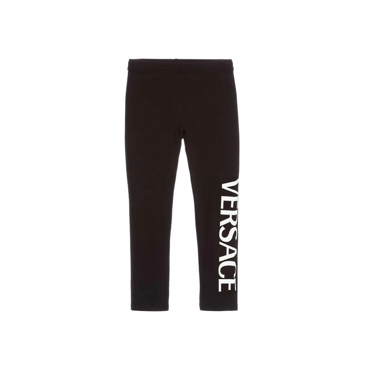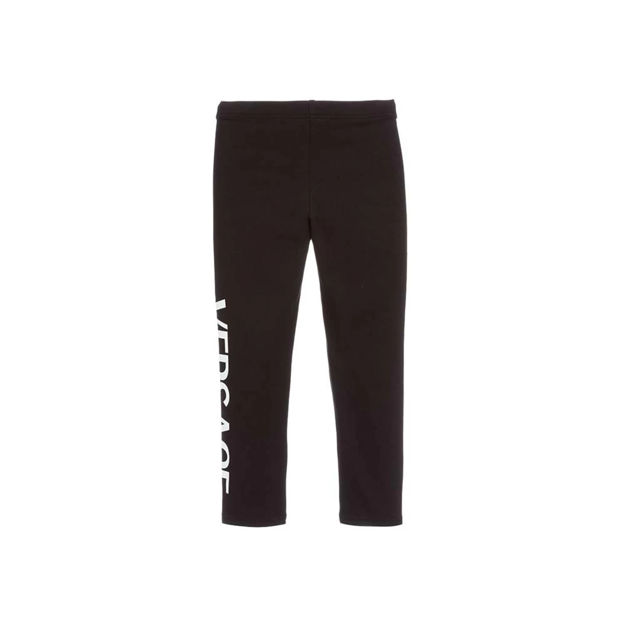 Black logo trousers from YOUNG VERSACE featuring an elasticated waistband and a contrasting brand logo to the bottom of the left leg.